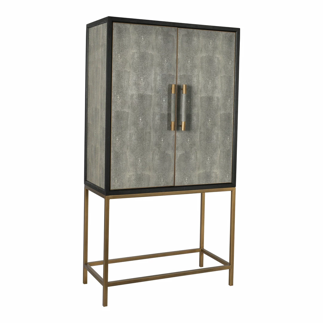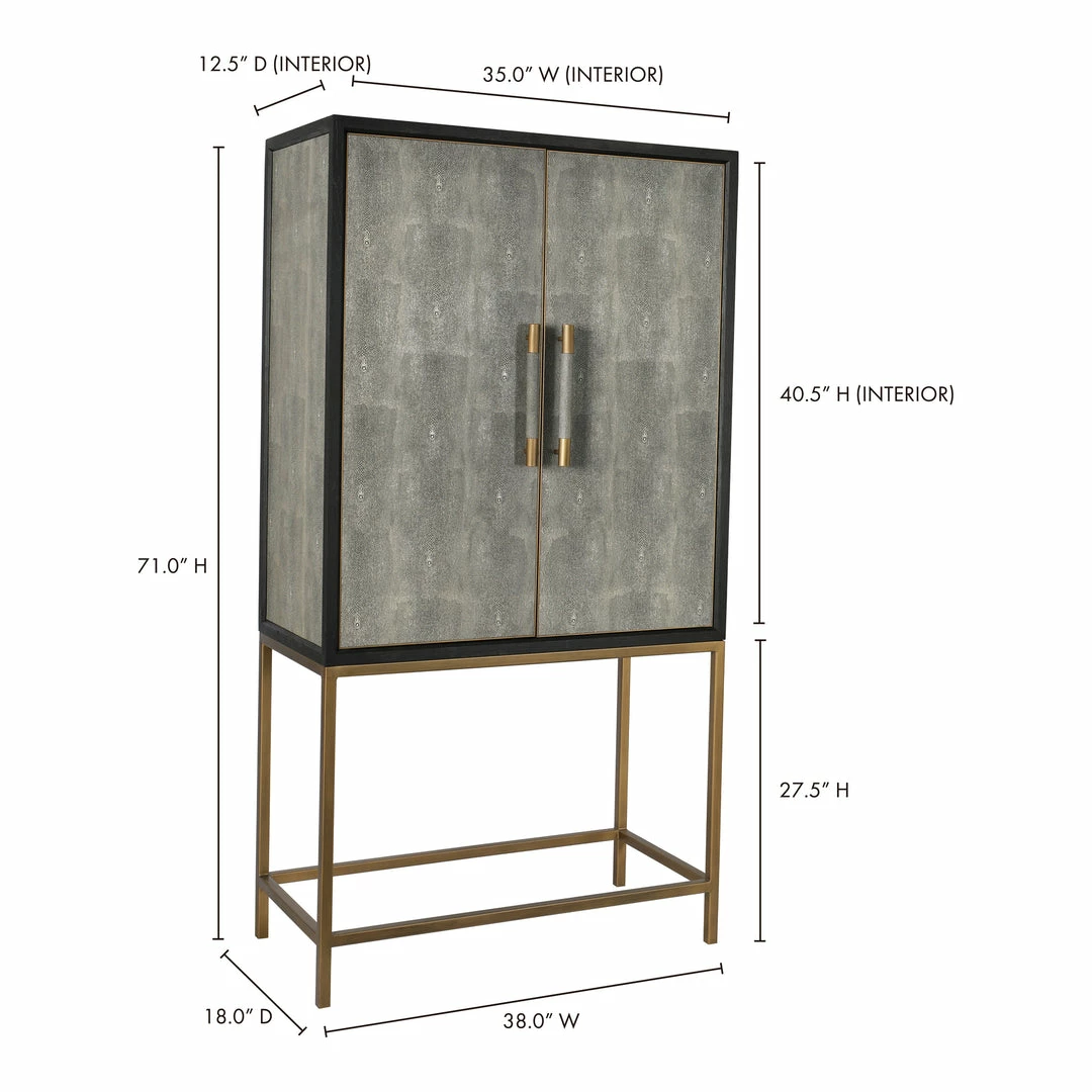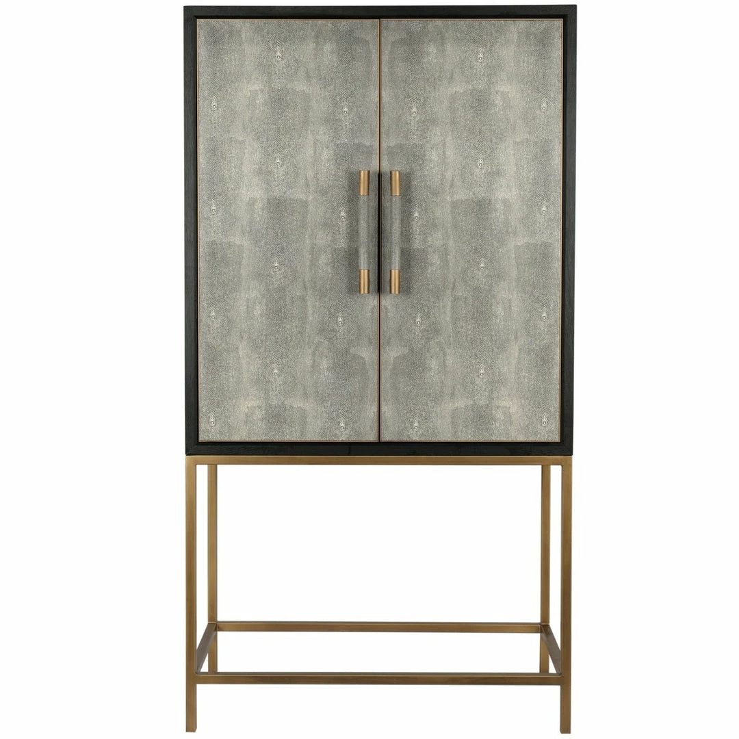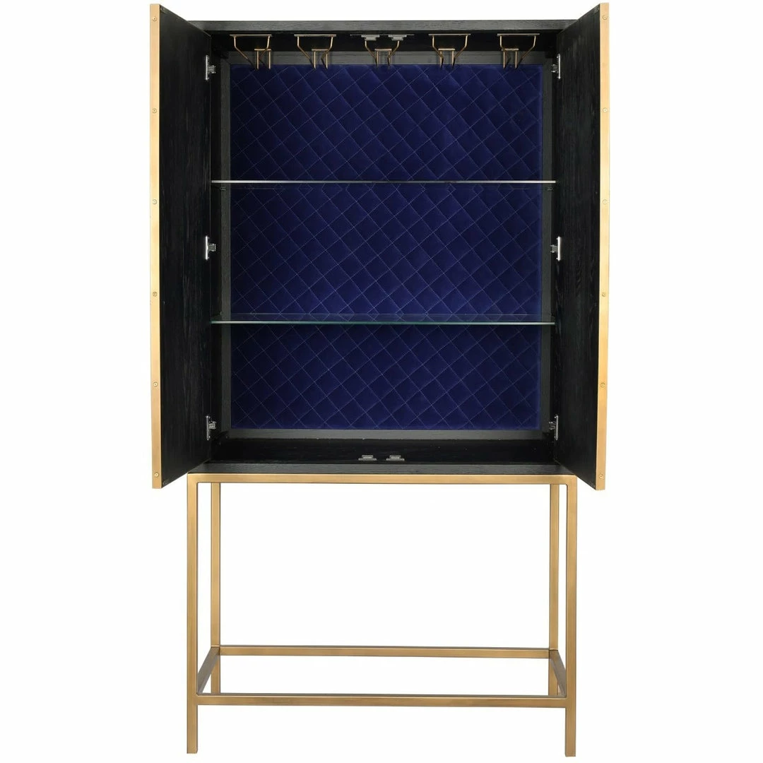 Solid oak wood construction. Contemporary design. The MakoΒ Bar Cabinet features shagreen surfaces encased in a matt black lacquer frame with warm brass accents for an understated yet elegant look that transitions to any decor. Inside find racks for stem glass, two glass shelves highlighted by a navy quilt backing.Β