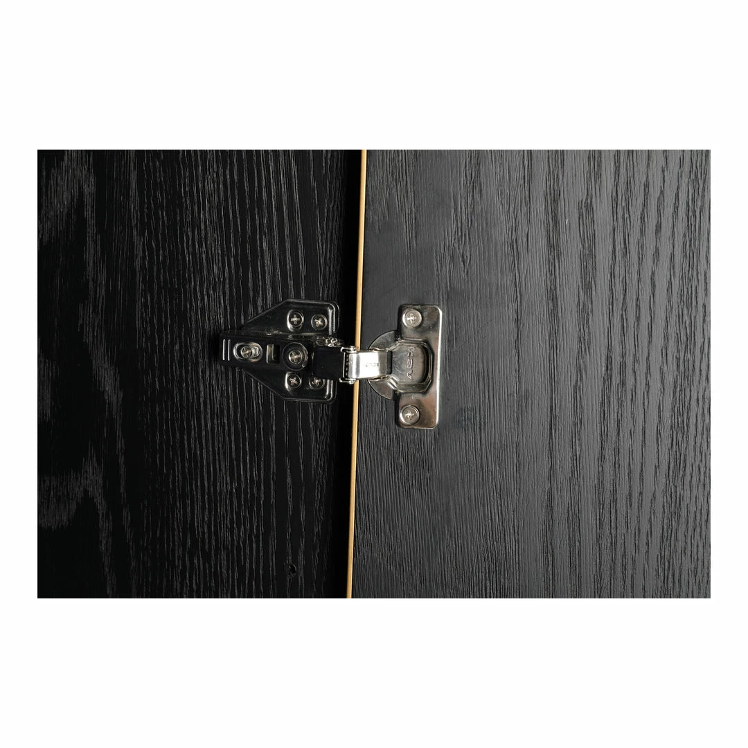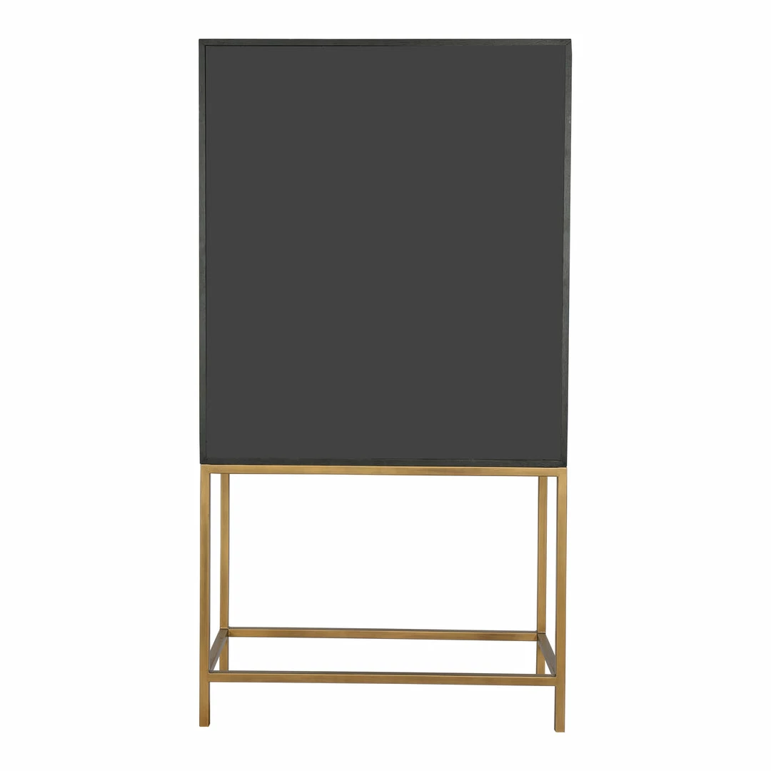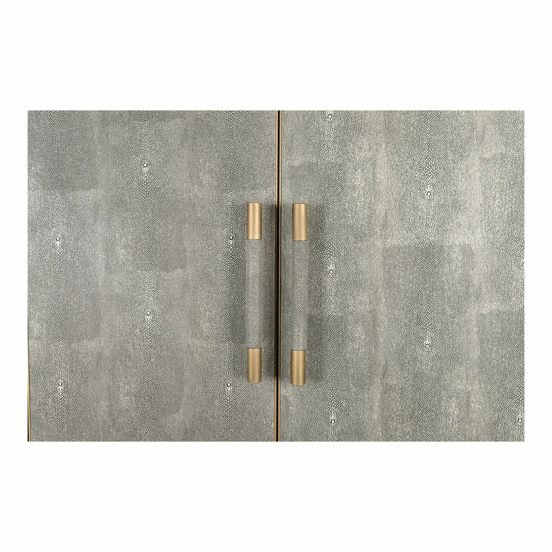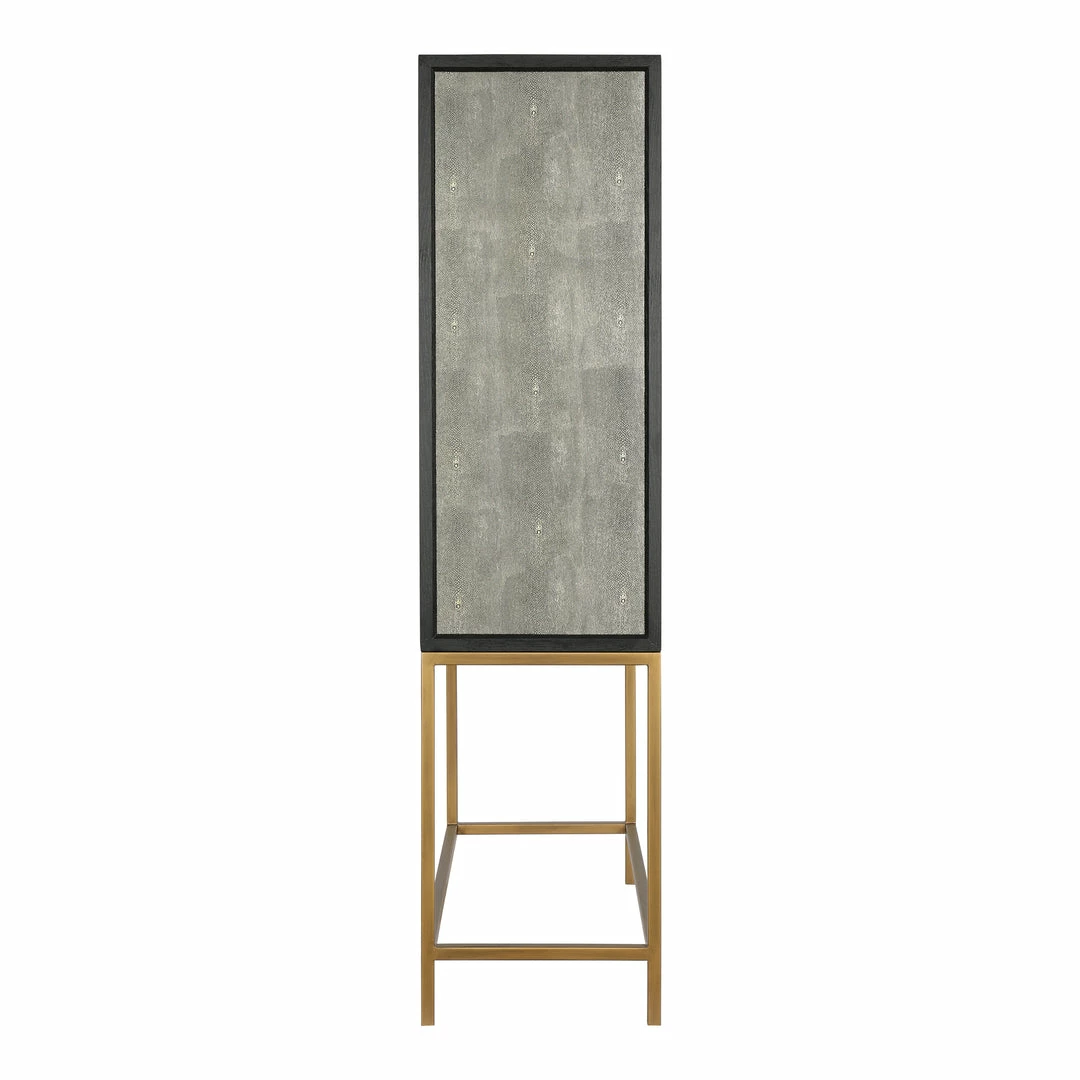 Solid oak wood construction. Contemporary design. The MakoΒ Bar Cabinet features shagreen surfaces encased in a matt black lacquer frame with warm brass accents for an understated yet elegant look that transitions to any decor. Inside find racks for stem glass, two glass shelves highlighted by a navy quilt backing.Β