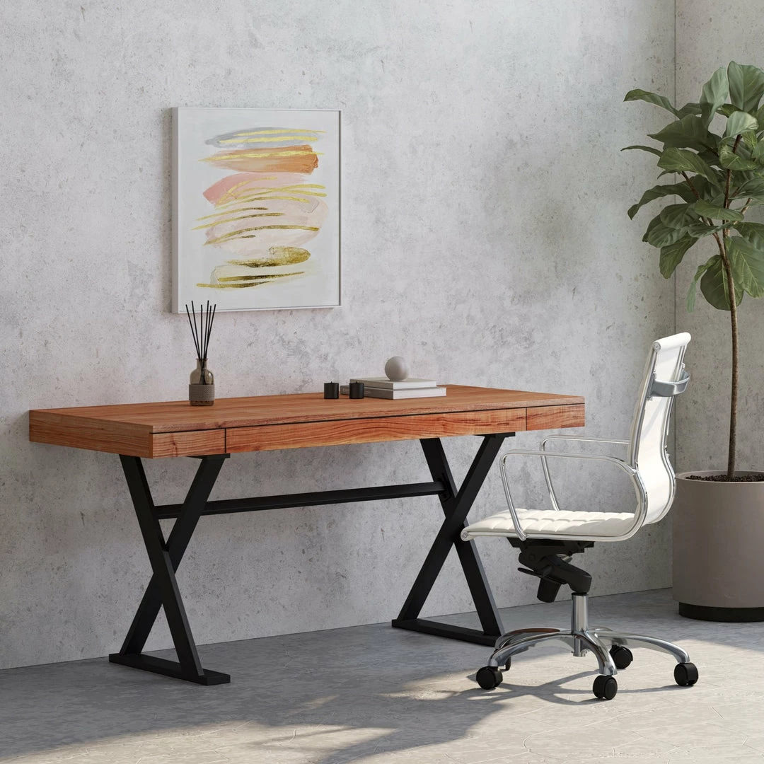 Walnut veneer desk with a metal base and 3 drawers for storage.