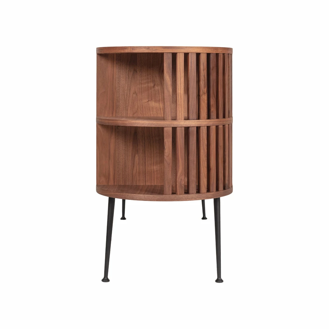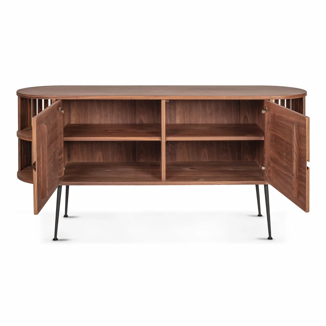 Channel the icons with this Palm Springs Mid-Century throwback buffet. With its rounded pill shape and slatted wood open shelves, the Recap Buffet will bring classic style and function to your dining or living room. Barn style doors reveal two roomy cabinets for storing everything from books to table linens to dinnerware.