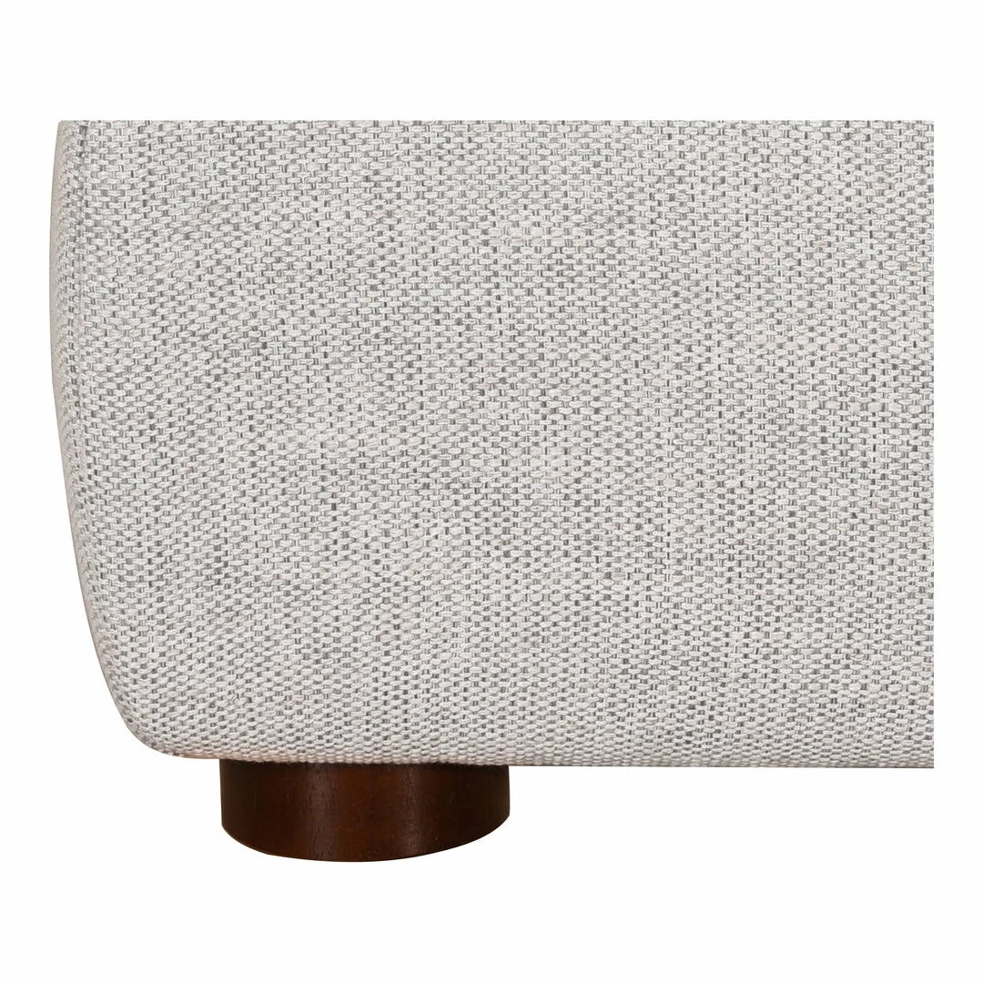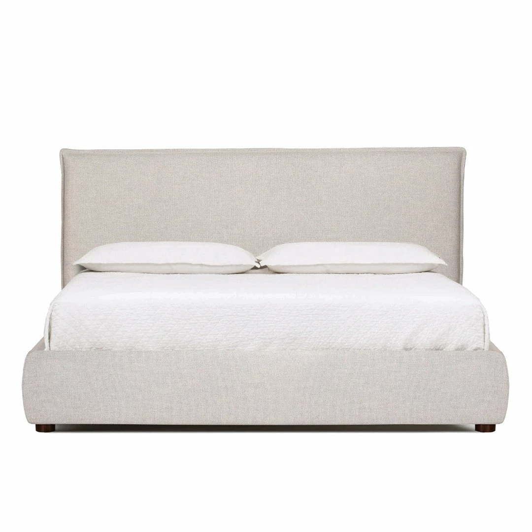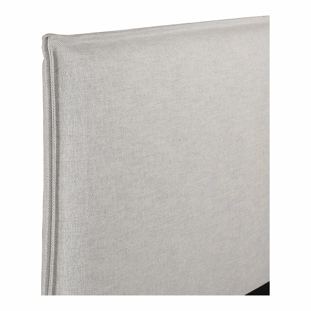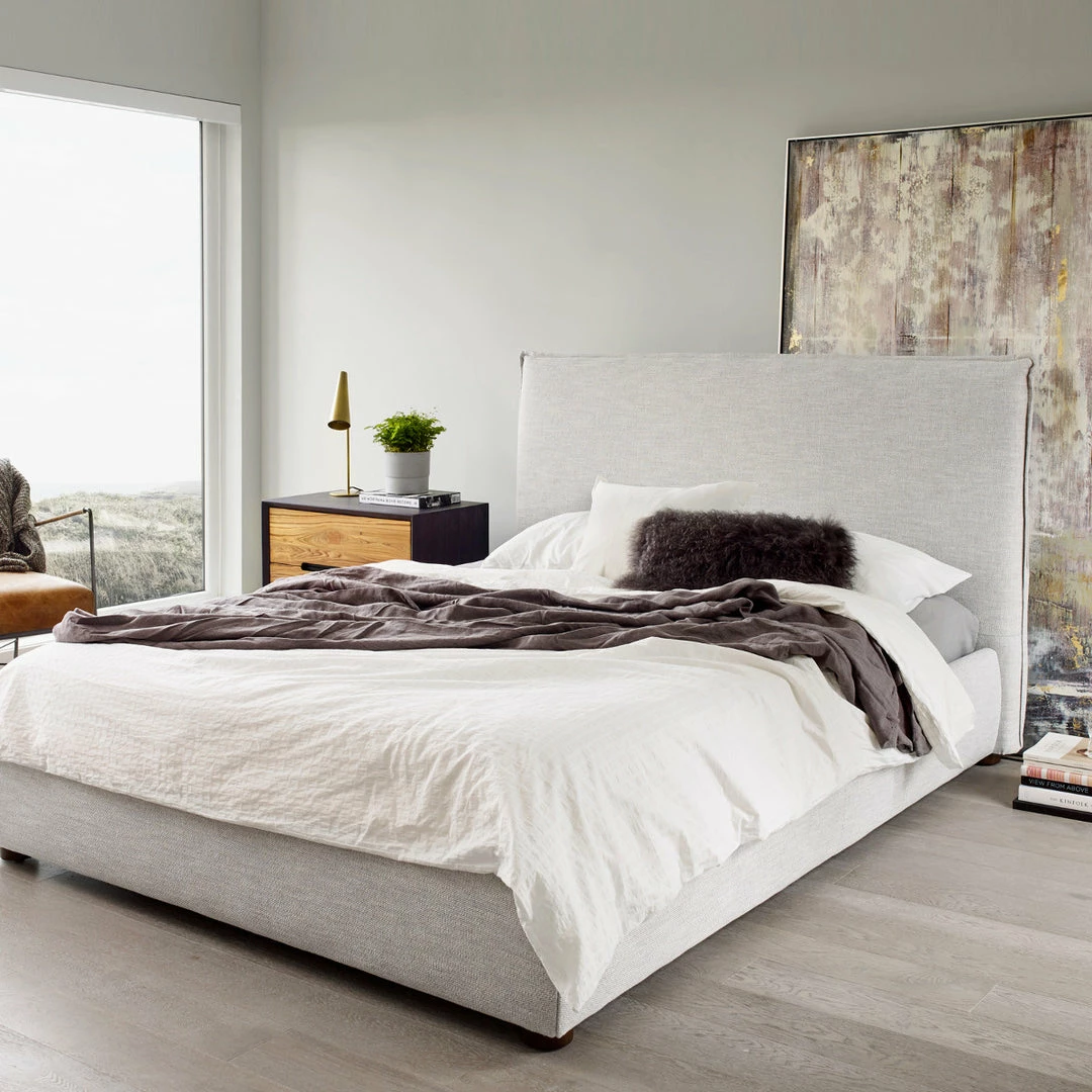 Tailored neat all the way around, the Clean box bed silhouette of the Sundry platform bed is sophisticated casual in a light stone grey linen fabric. Neutral variegated poly weave wraps foam-cushioned hardwood frame from the slim headboard to low-profile side rails and footboard in one streamlined sweep.