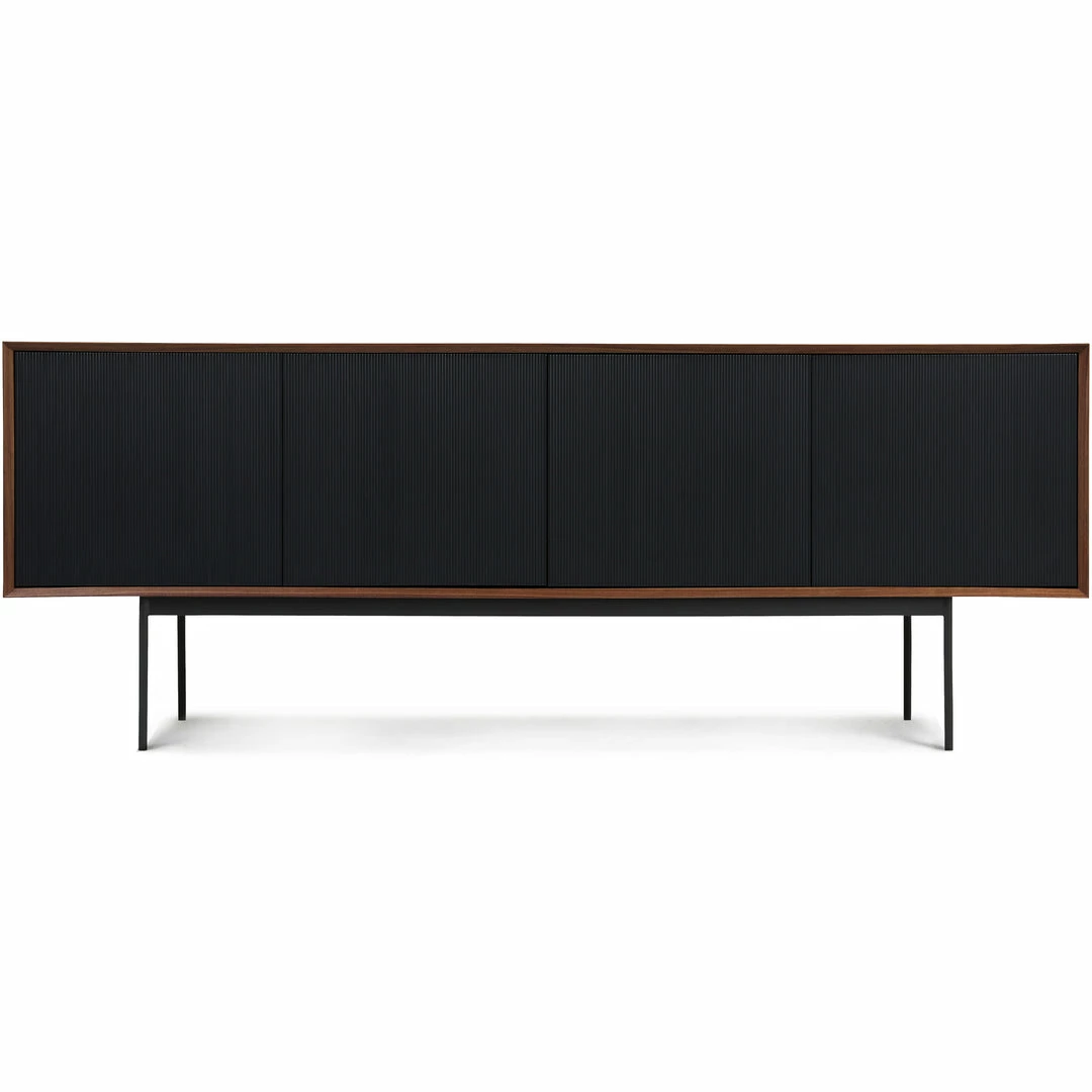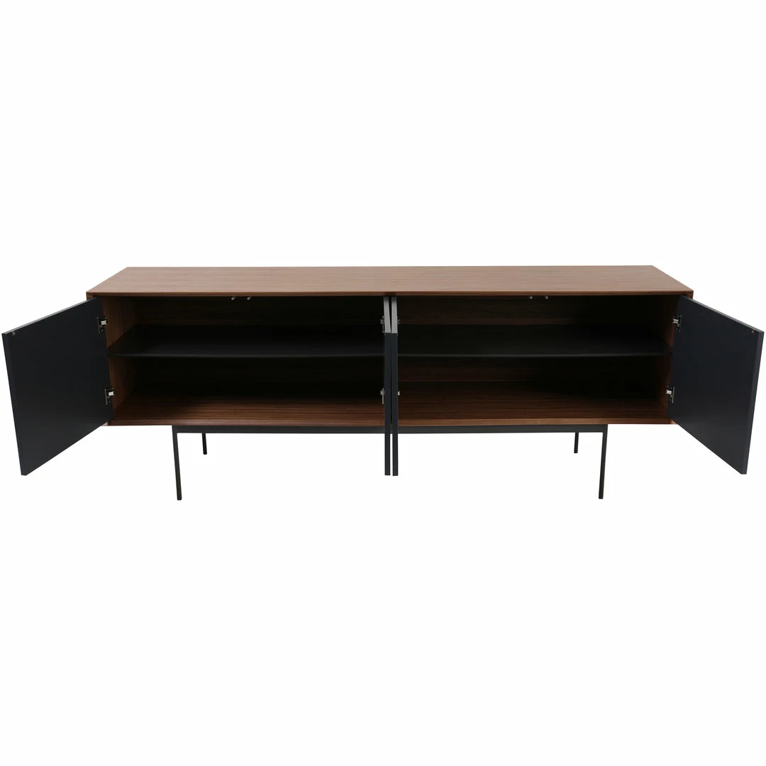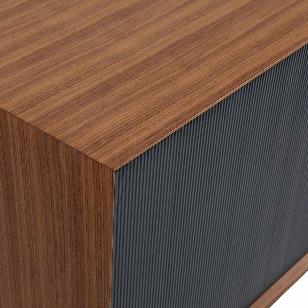 A simple design that packs a punch. Dark stained walnut veneer accompanies black corduroy wood detailing on the cupboards. This mid-century modern sideboard’s large storage compartment opens to reveal four large shelves, ideal for storing your favorite board games and consoles.