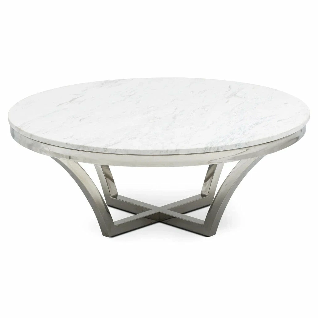 The Aurora coffee table is classic contemporary elegance with a luminous 1 inch marble top and high polish stainless steel frame. The simple open cross brace design articulates refinement and elegance echoed by the luxury of marble. Available in Black Wood Vein or White Marble.