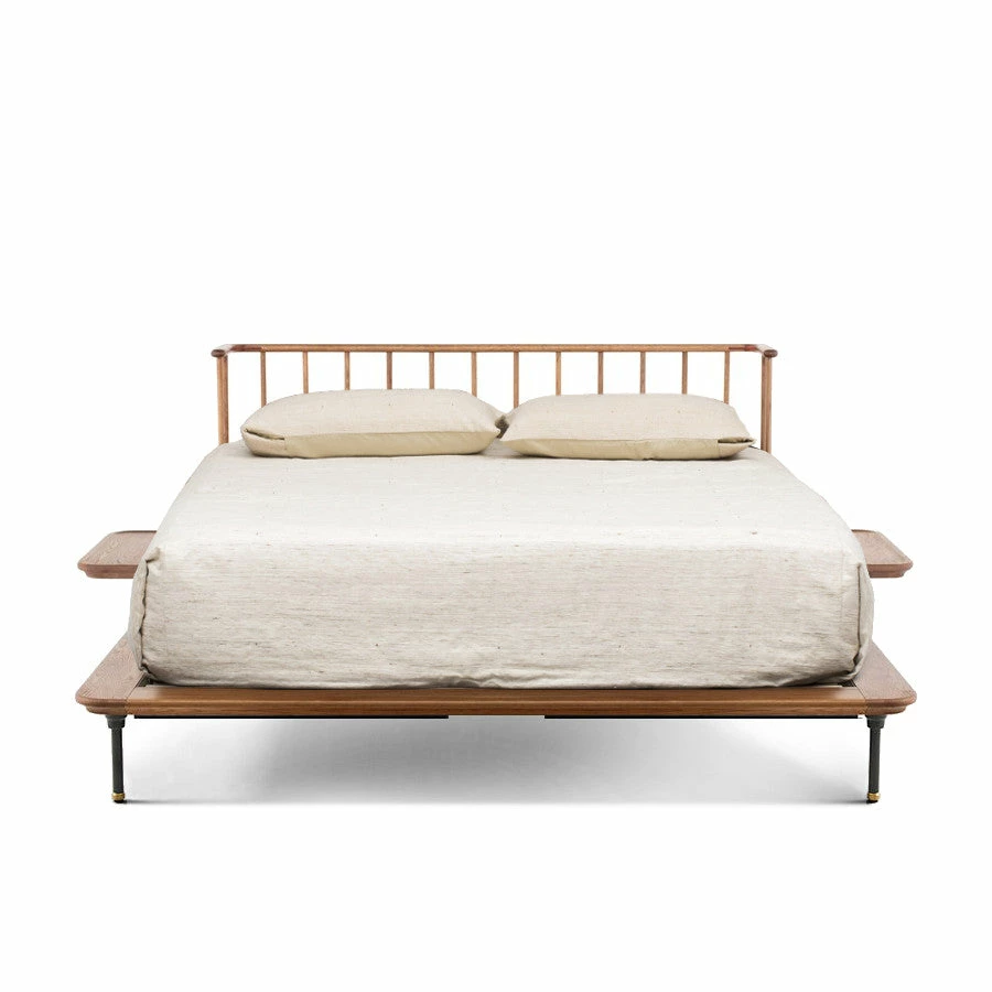 A timeless mid-century design, the Distrikt Platform Bed is made from solid hard-fumed oak with carved and rounded ends. Solid oak construction with African padouk joinery details command attention while remaining versatile in composition leaving ample room. A solid steel base finished with brass levelers ensure a great sleep in style while a built-in table on each side provides convenient space for a lamp, alarm clock and other essentials.