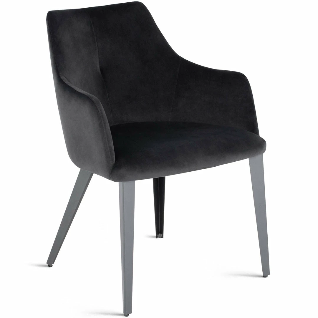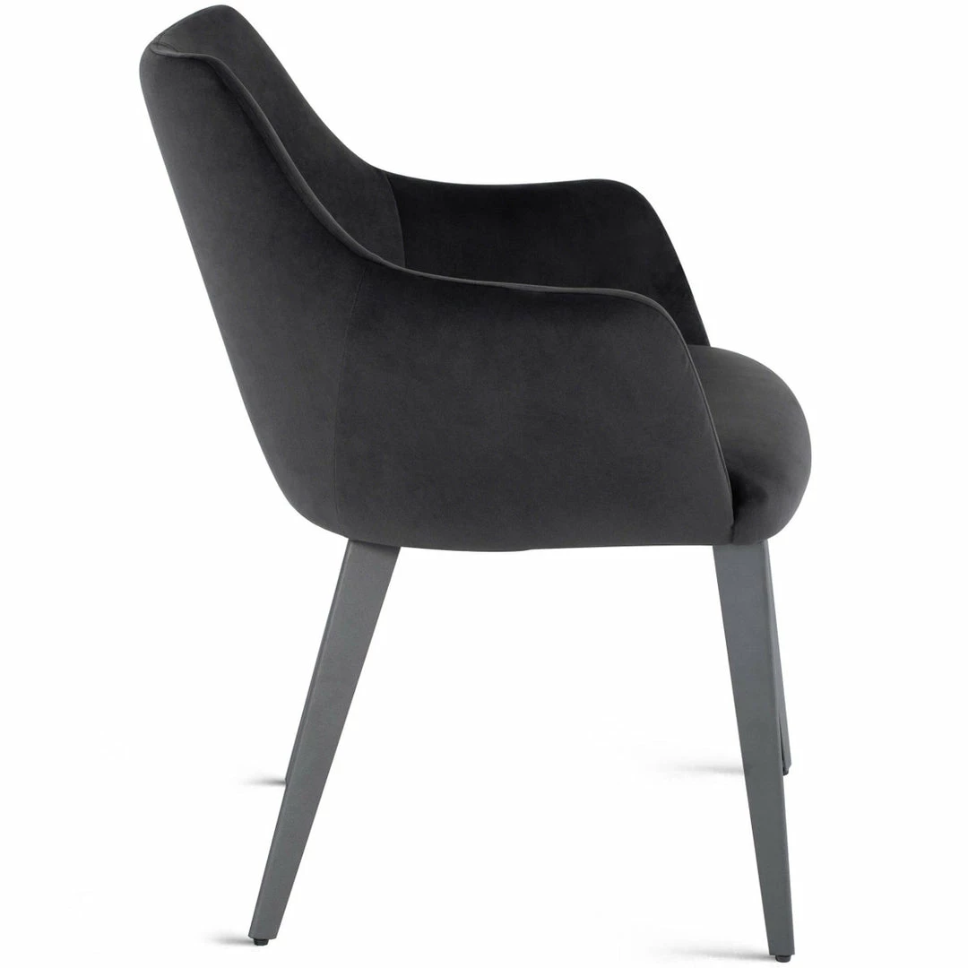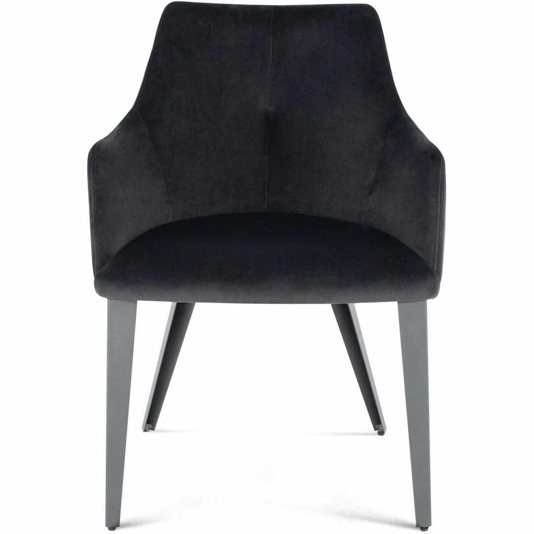 The Harvey dining chair seamlessly blends comfort with contemporary style. This soft velour velvet upholstered arm chair incorporates a smart single tufted accent, finished with striking spike steel legs.