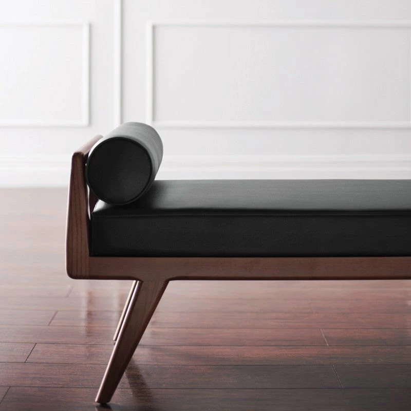 An elegant frame crafted in ash stained walnut the Ava occasional bench blends classic elements with a modern paired down aesthetic. Smartly tailored, padded black naugahyde upholstery is neatly integrated into the body of the Ava, an end pillow provides added comfort and a graceful finish.