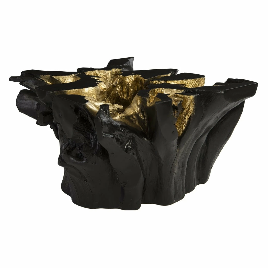 Matte black and high shine metallic gold is on-trend! This freeform table is cast from a real piece of solid wood. We carefully preserve all the natural details of the original so that this version has the same lines and indentations still intact. We lovingly source our wood and find pieces we believe will be both functional and beautiful. Striking black finish with gold leaf interior detailing.