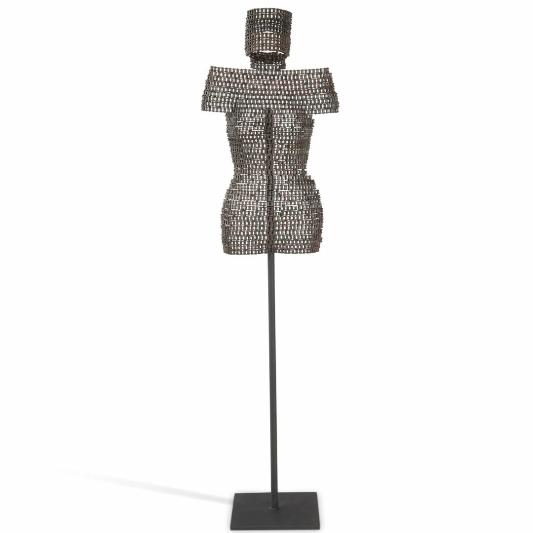 The Chain Bust Sculpture is a metal sculpture made from discarded bicycle chains that have been welded together to create a human form. The way it floats above the minimalist base adds drama to this unique metal sculpture. At 67-inches high, it will be a true statement piece in a room. Made from a recycled product, the artful use of a mundane material combined with contemporary styling makes this piece a perfect fit for modern organic ethos.