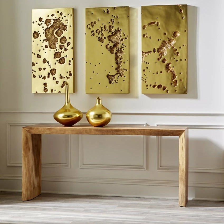 Each Waterfall Console Table by Phillips Collection is made from one slab of wood. This artisan technique takes the mitered edge where the cuts occur and folds them at a ninety-degree angle so the grain continues along the sides.