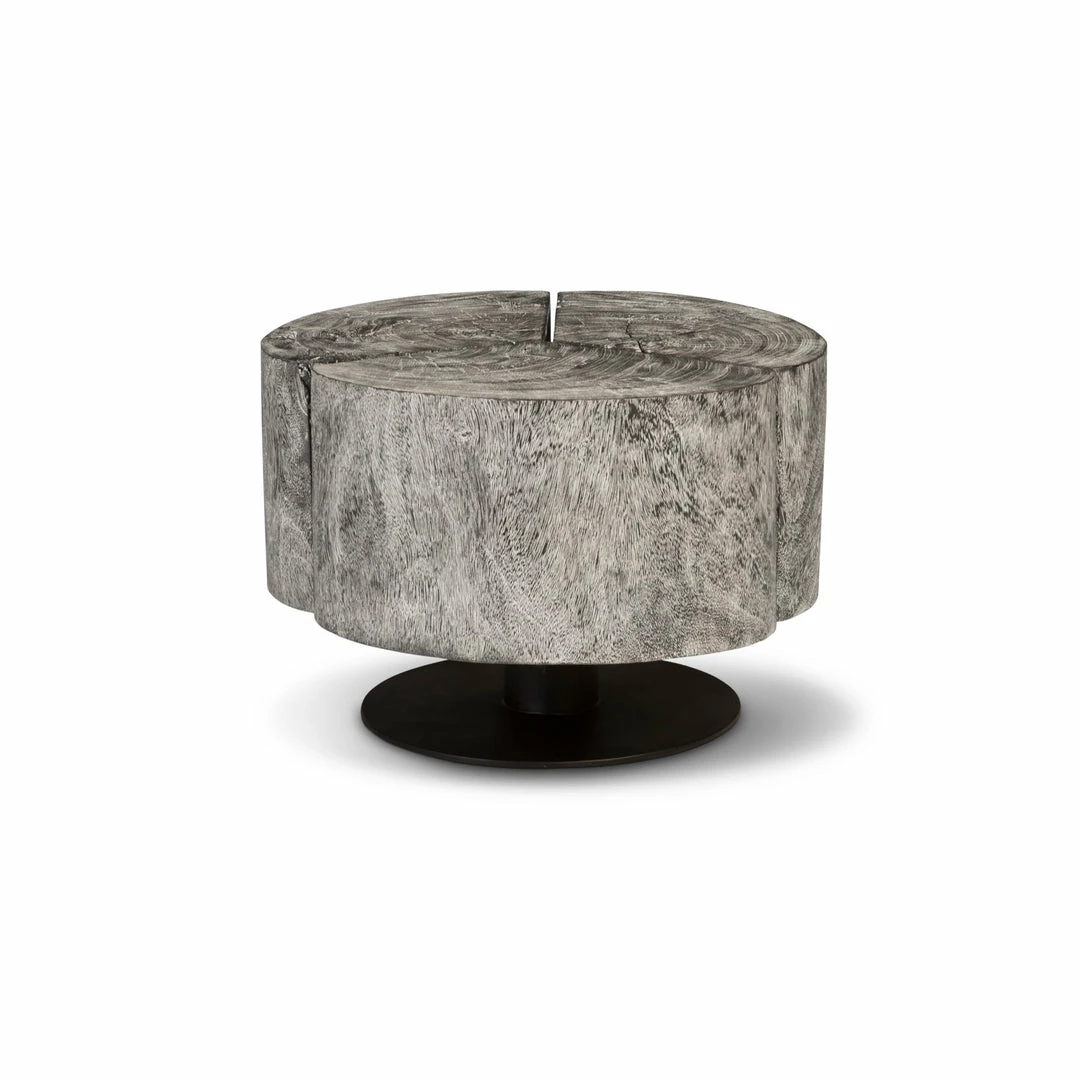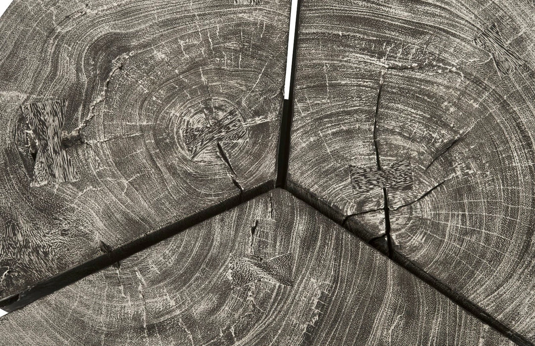 You wonβt need any other lucky charm when you place the Clover Grey Stone Coffee Table in a room. Carved from blocks of chamcha wood, the curved sections that make up the top are affixed to a black metal base. What makes this wood coffee table extra special are the swirls of graduated hues that darken as they flow toward the middle, the whorls representing the rings of the tree as it grew. This is only possible because we have reclaimed a portion of a massive felled specimen that would have been abandoned to decompose on the forest floor and made a piece worthy of its beauty.