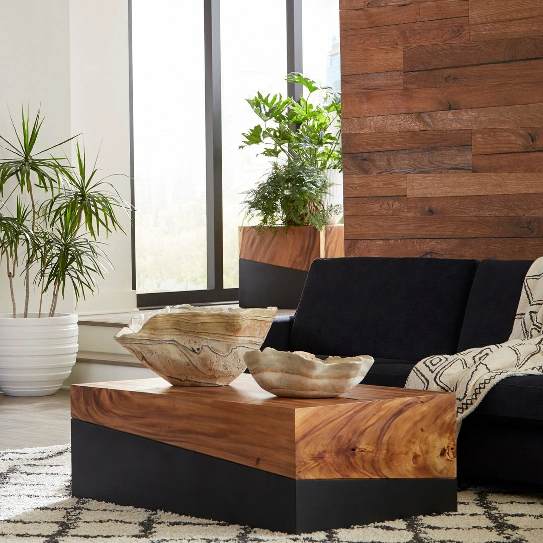 In combining the deepest black and natural wood on slant, as we have with our Geometry Rectangular Natural Coffee Table creates a sophisticated profile that brings organic warmth and contemporary cleanness to a space. The surface variations of the woodgrain also bring texture into a room. We have a wide array of shapes in coffee tables, console tables, and side tables in this collection, as well as tables in a gray finish, and stools and wall tiles. Each of these reflects the ethos that we personify: modern organic..