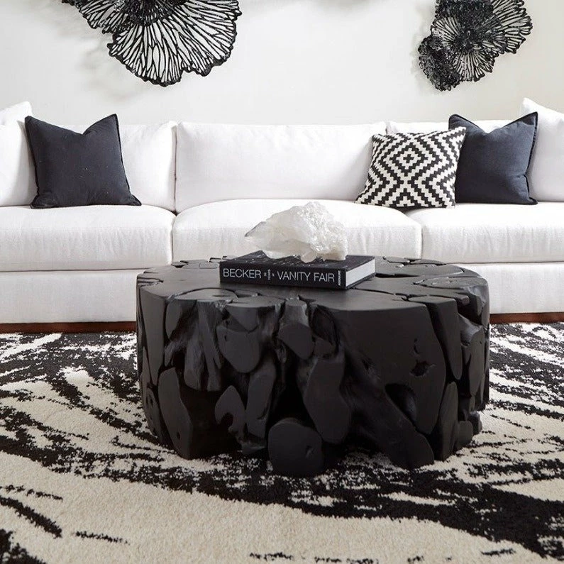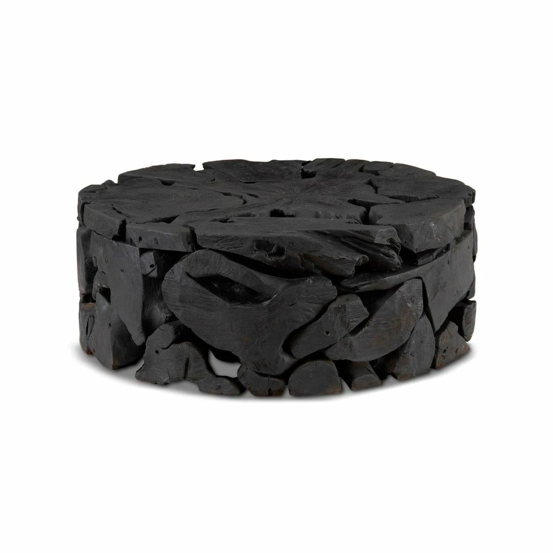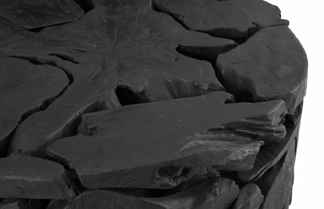 With exquisite craftsmanship, we have rescued the scrap pieces of teak wood that are hand assembled to create the Teak Chunk Round Coffee Table from being one of natureโs finest castaways. Though the shape is simple, the complexity of the parts that make up the whole illustrates the talent of our craftspeople. Unorthodox designs call for unorthodox finishes; the natural wood grain shines through the dark, charcoal-hued finish to a magnificent degree, truly making this table a unique design statement that will demand attention within your space.