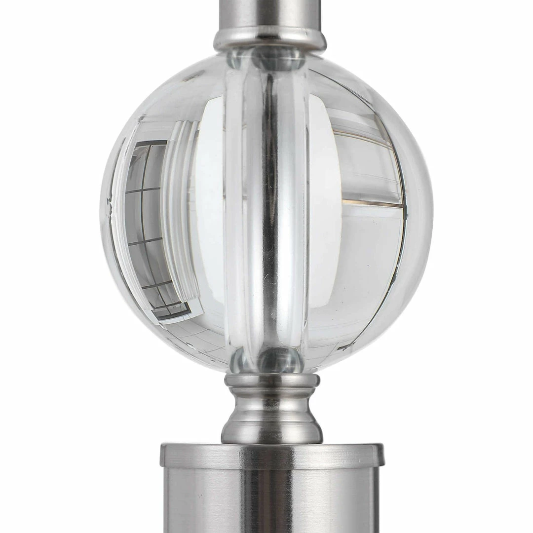 This simple but elegant table lamp is finished in brushed nickel with crystal accents. The round hardback shade is a white fabric with light slubbing.