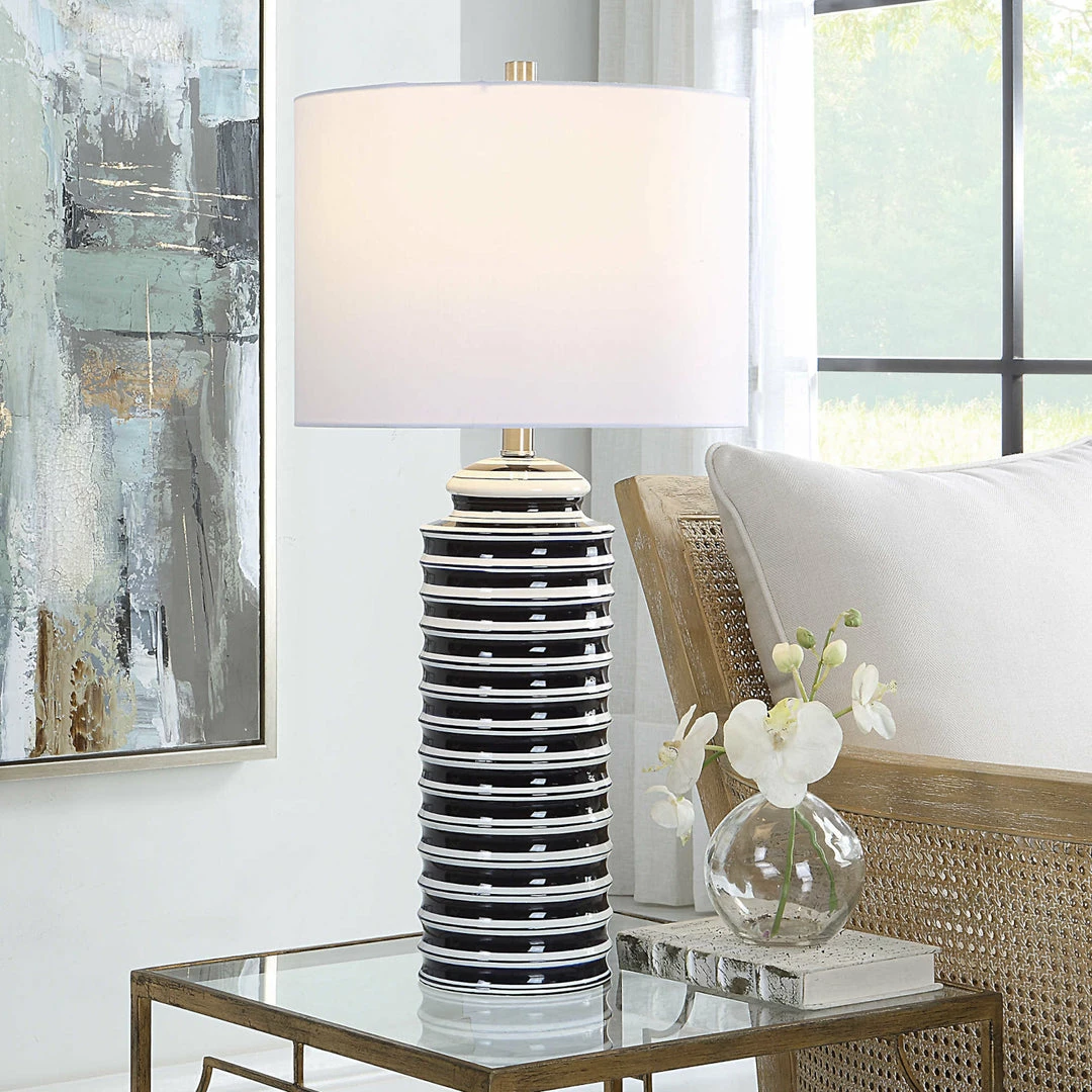 The navy and gloss white finish combination of this ceramic table lamp is perfect for a coastal setting. The white ribbed body is accented with strips of navy, with brushed nickel accents. The look is completed with a white linen round hardback shade.