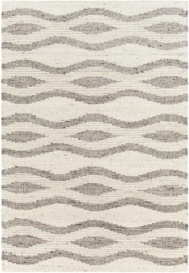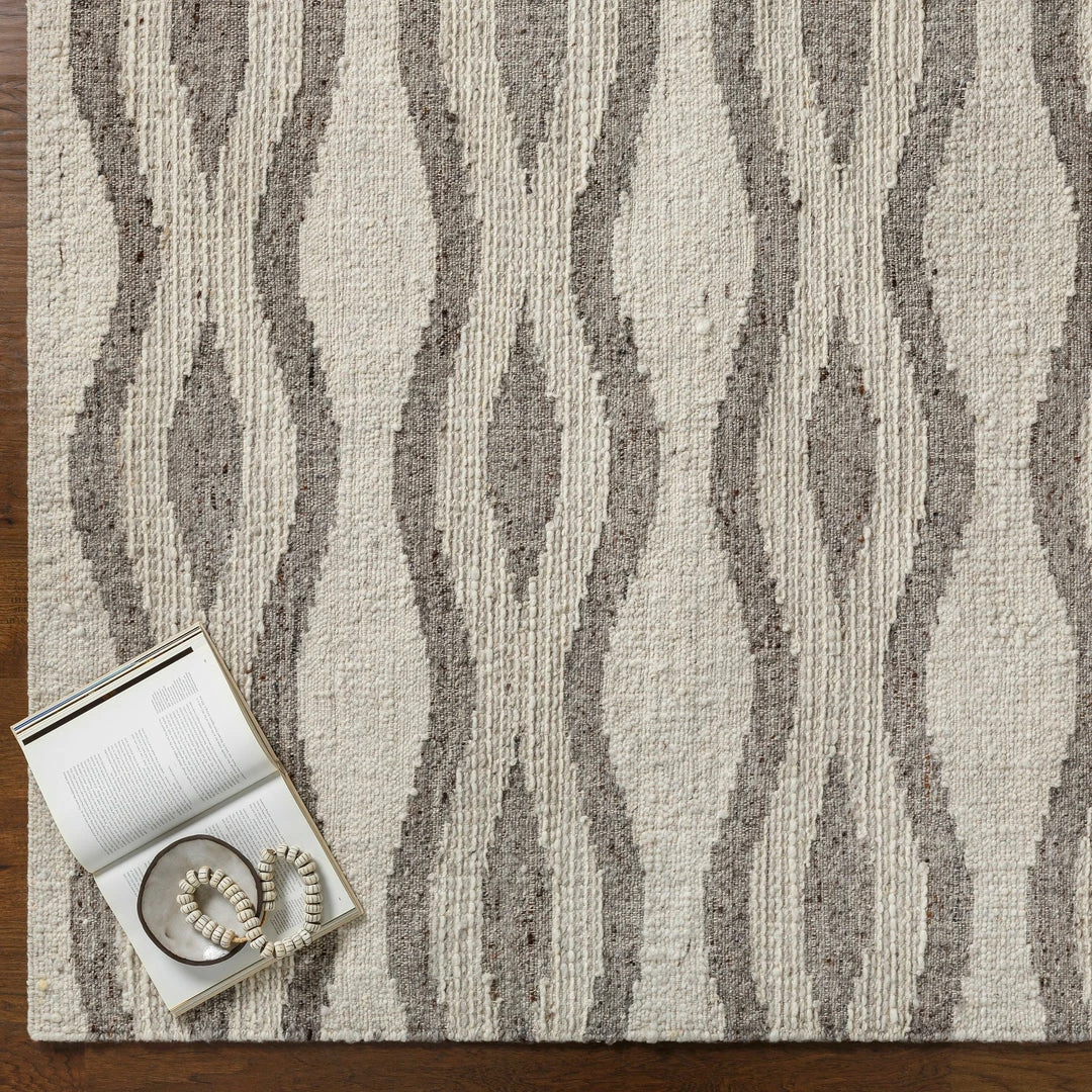 Simplistic and effortlessly modern. Hand-woven from wool, variegated grey and charcoal hues create a sweeping geometric pattern through Benjy’s cream colored foundation adding graphic contrast with subtle texture to this contemporary design.