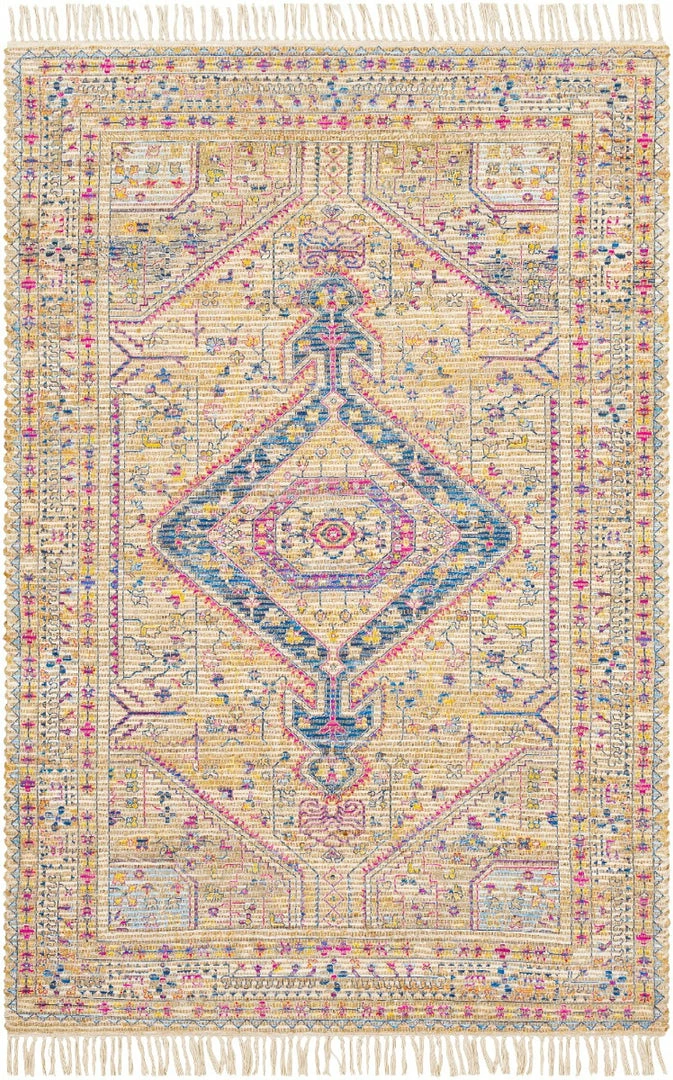 This meticulously woven blended jute rug features a striking global inspired print design. Perfect for adding bohemian eclectic charm to any space.