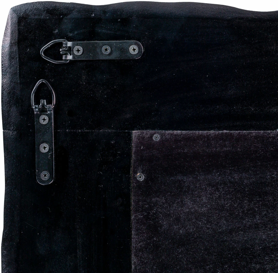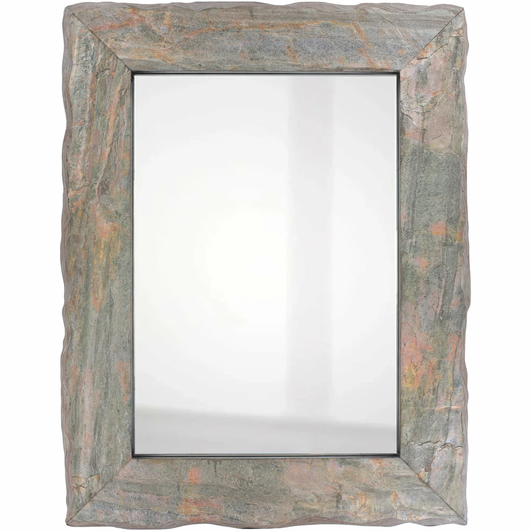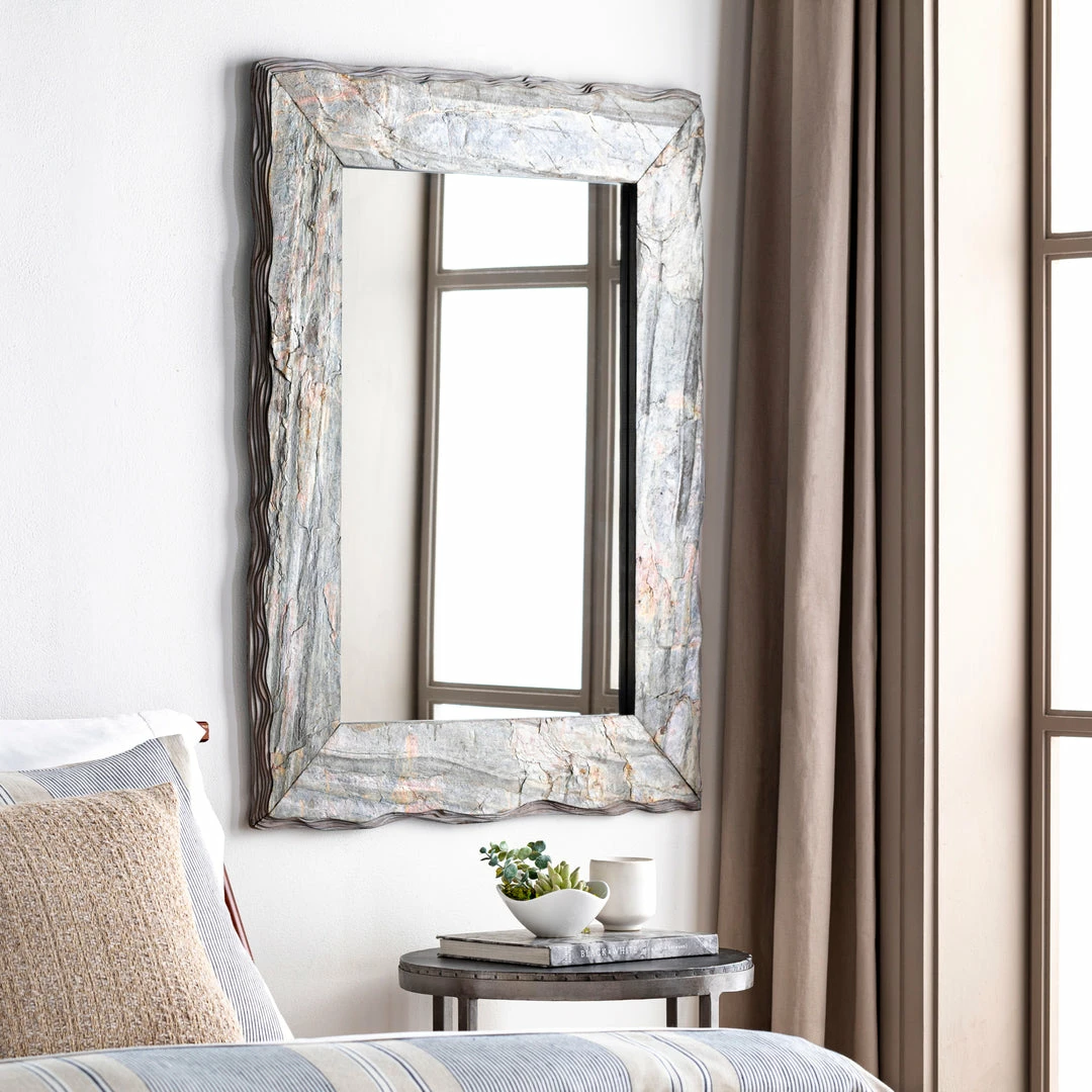 Textured layers of composite stone in natural and desert twilight hues come together to frame this earthy eclectic wall mirror. Color and finish may vary.