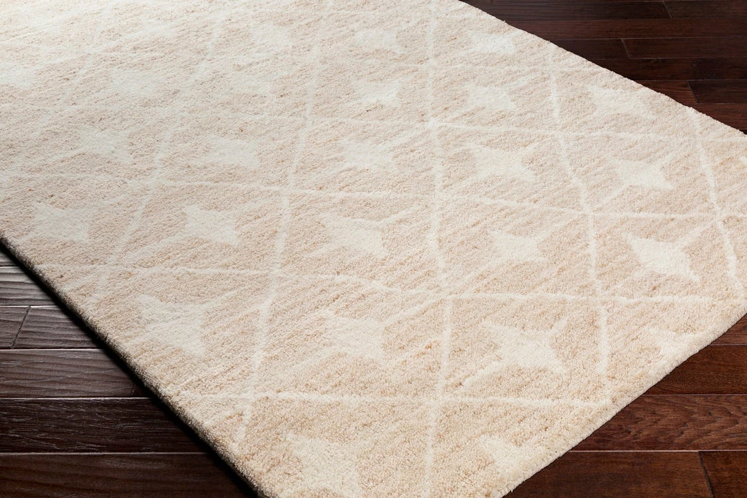 This plush contemporary hand knotted wool rug with sophisticated tribal motif uses variated soft color to show off its beauty and simple elegance.
