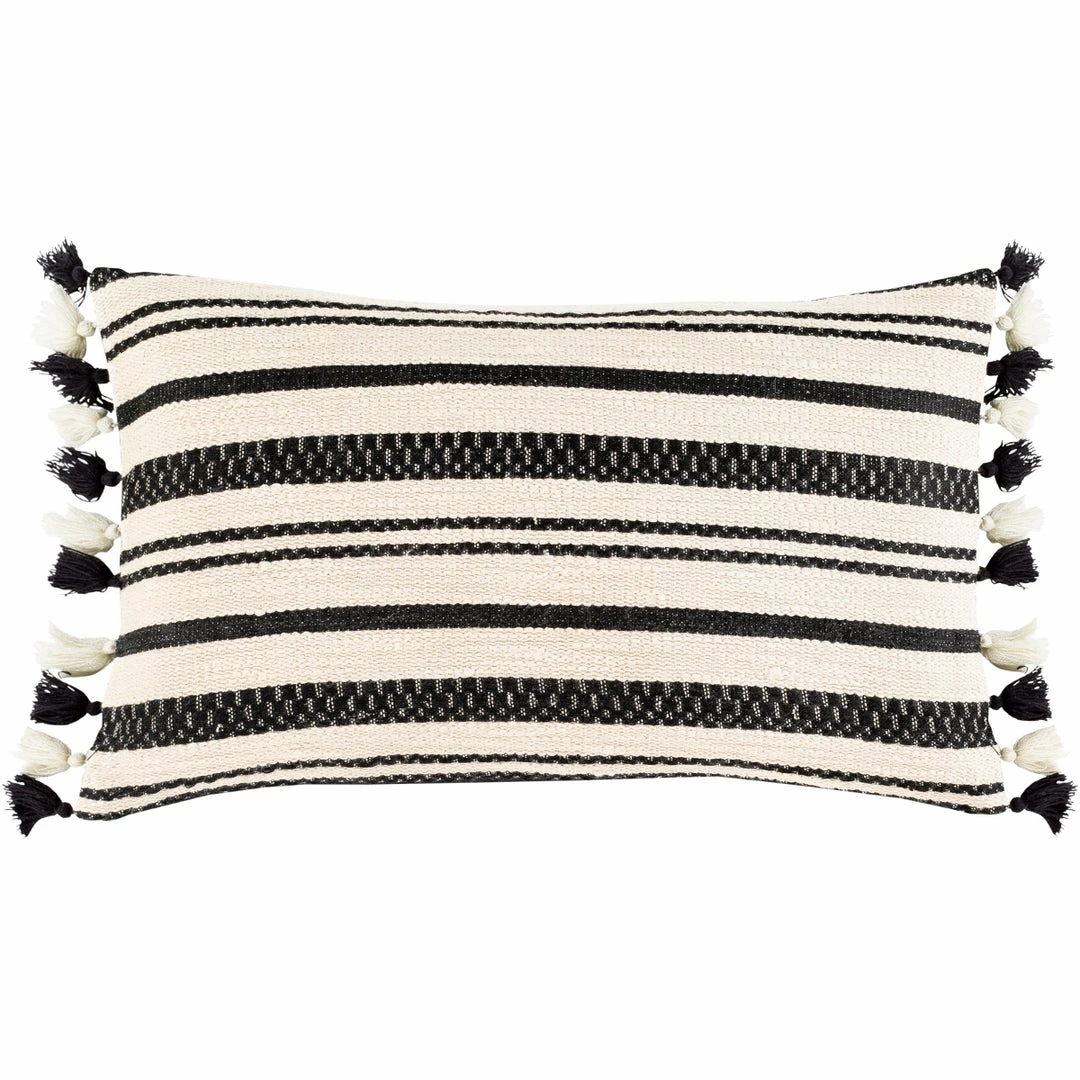 Ethnic black and white stripe lumbar accent pillow with tassel fringe detail.