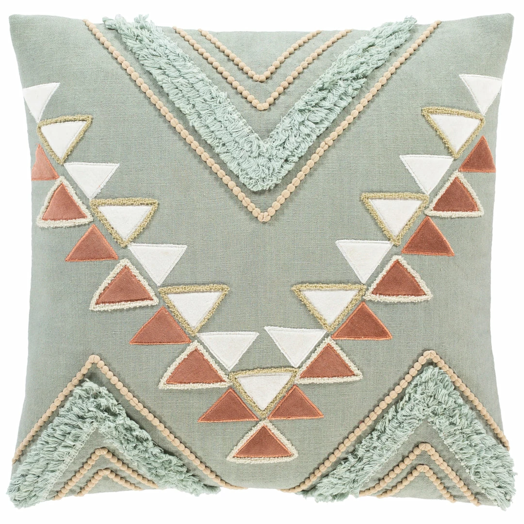 Embroidered patchwork accent pillow in mint and desert hues.