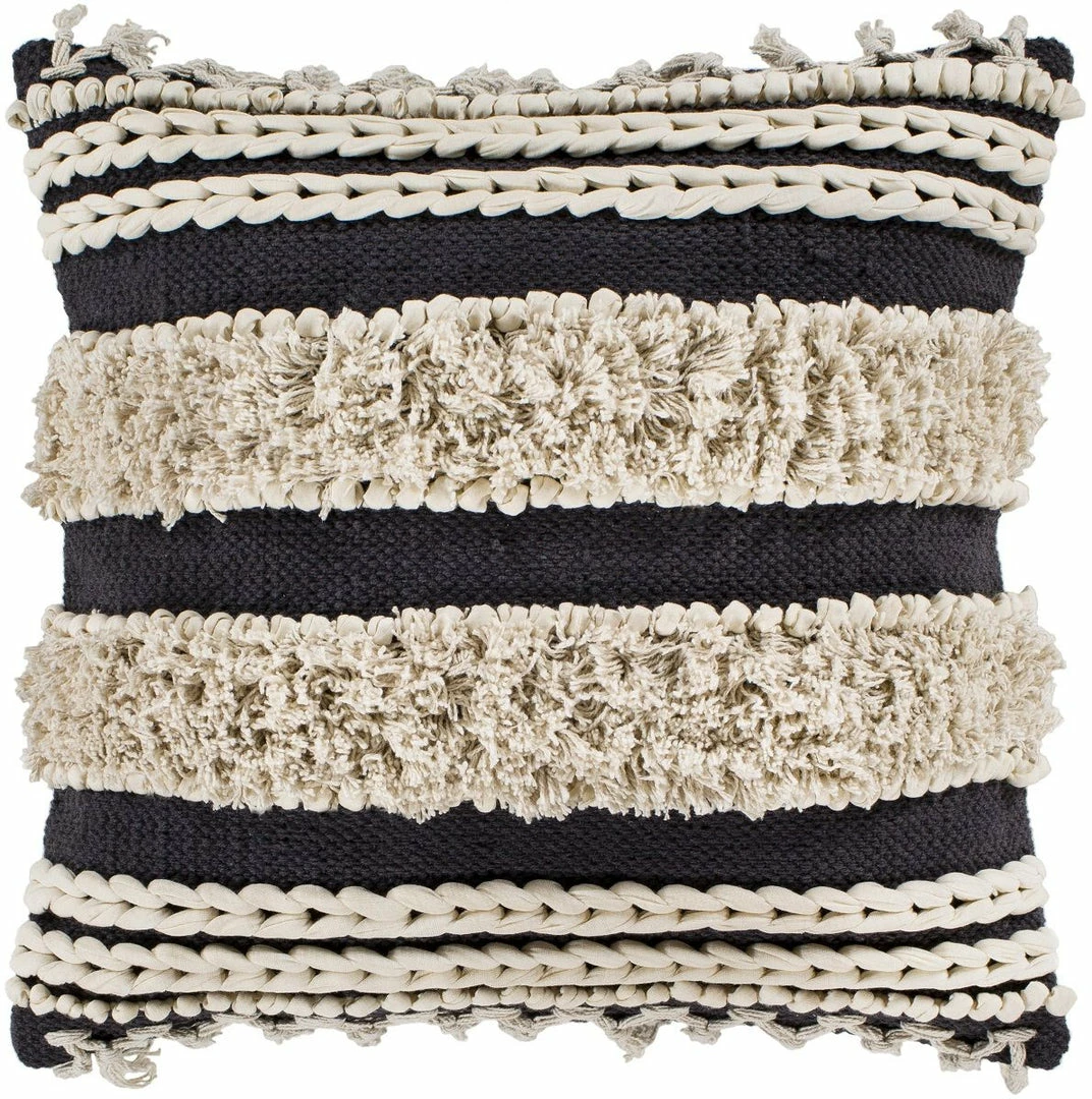 With rustic texture and tribal designs, this African safari inspired collection of pillows features shag stripes, braiding and tassel fringe detailing in nuetral and muted tones. Woven by artisans in India.