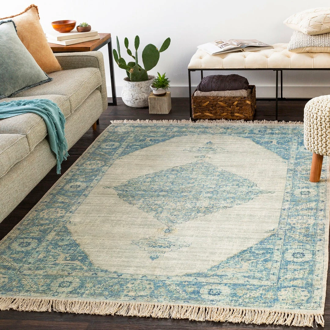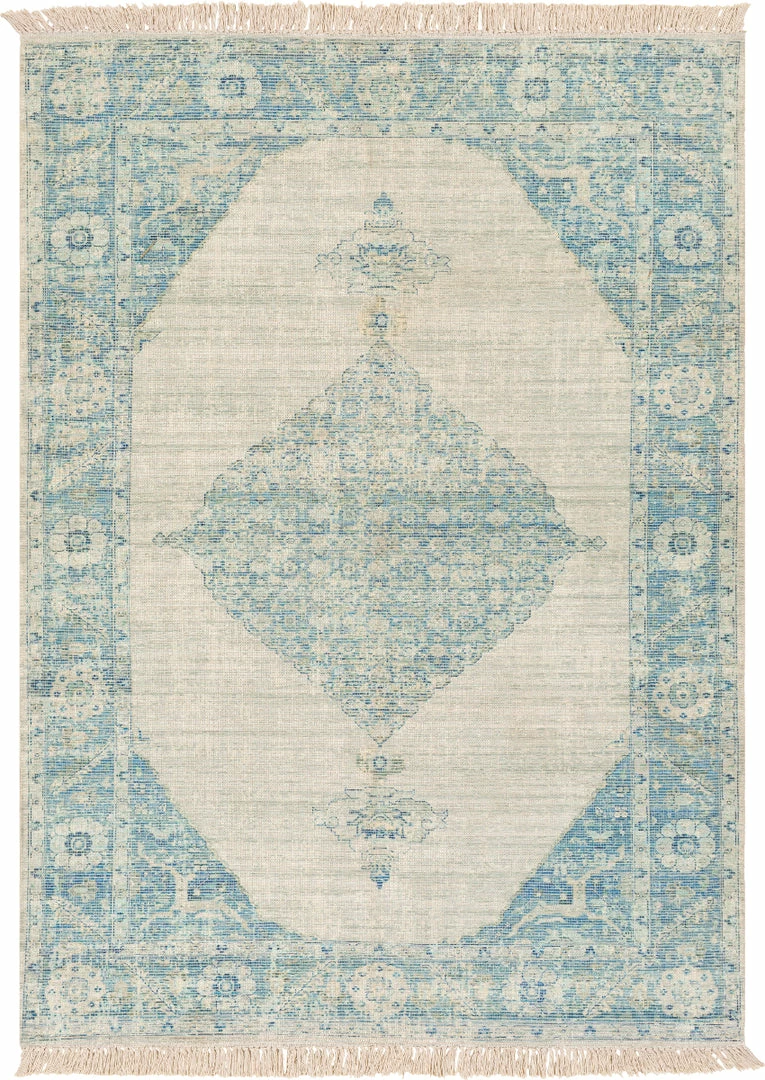 This distressed vintage print rug collection revives the antique-inspired look with a soft color palette finished with a refined fringe border.