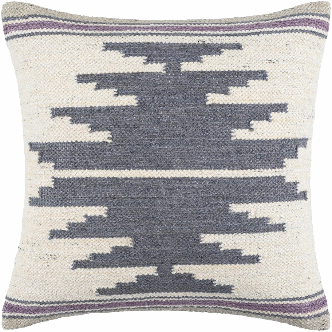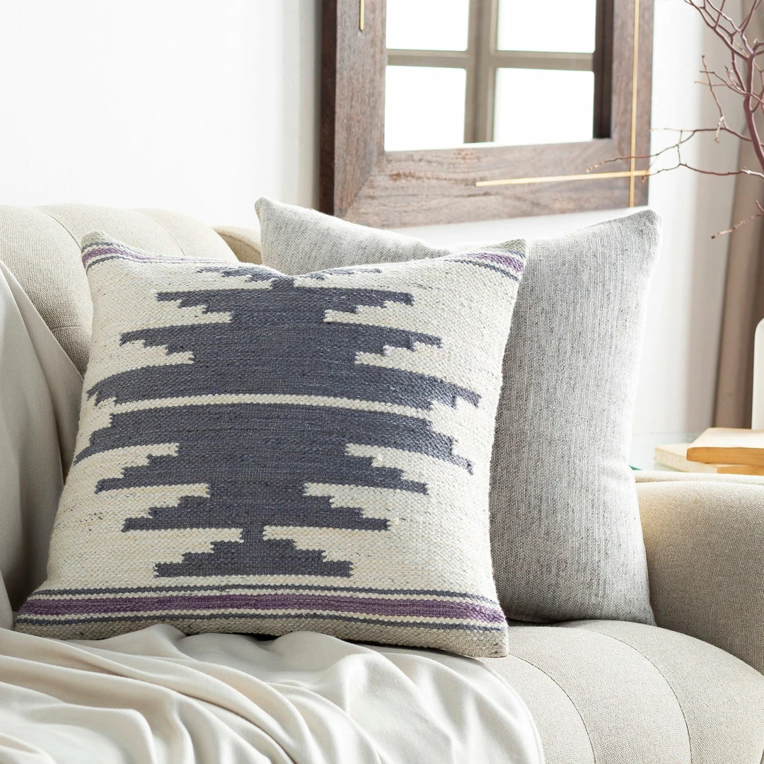 This southwest inspired pillow mixes neutral tones with denim and a bright purple stripe detail. Woven by artisans in India.
