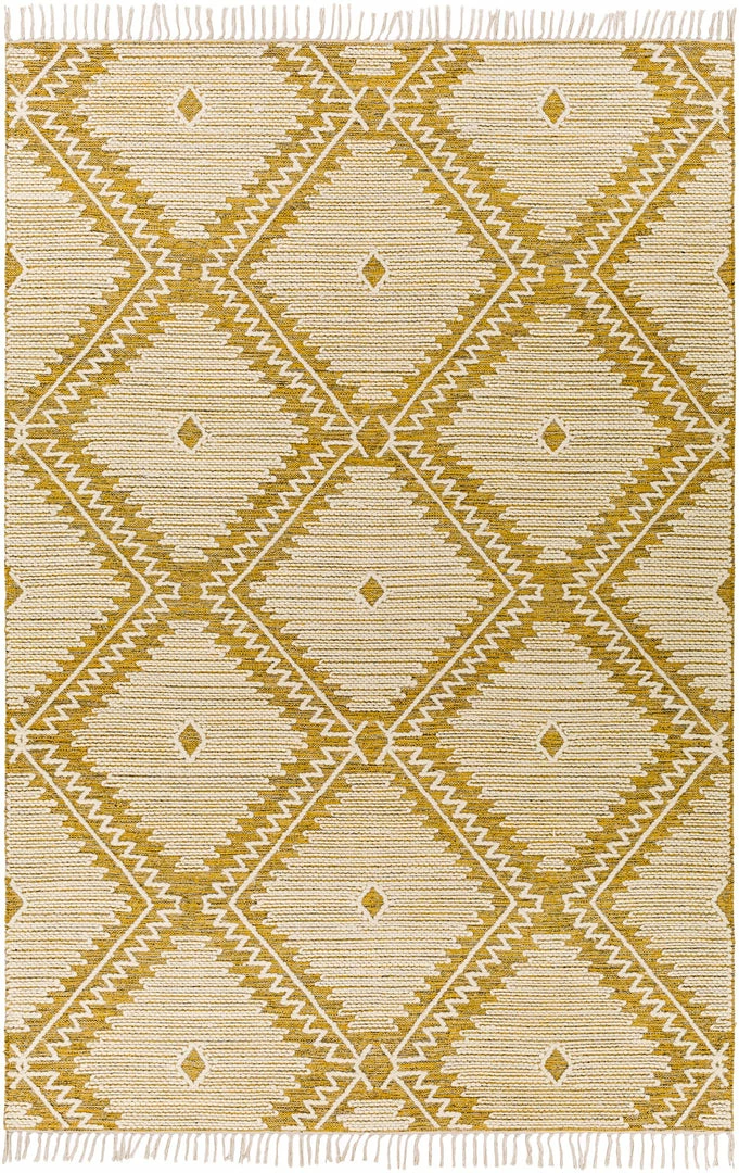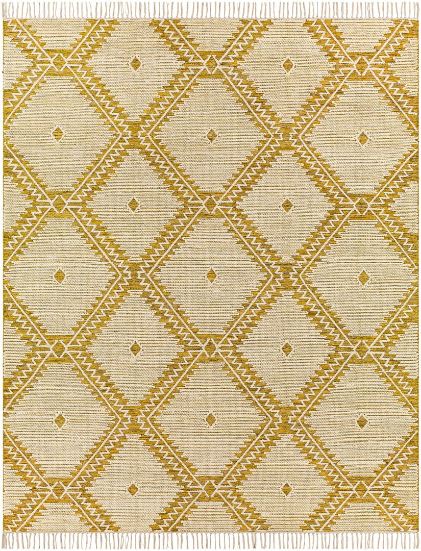 Pushing traditional flat-weaves to new heights. Its innovative high/low hand loomed texture elevates to form a pronounced pattern and faintly Moroccan style look with fringe border.