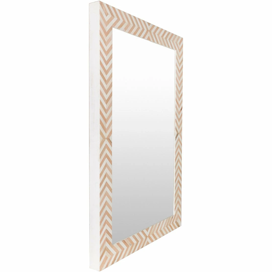 This wall mirror features alternating natural and antique white wood finishes in a chic chevron pattern. Perfect as a vanity mirror or in an entry to create a modern beach house aesthetic.