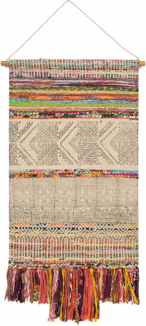 ThisΒ tapestry combines jute and colorful bindi cotton to make a stunning bohemian statement. Centered on a wooden dowel and topped with a string for easy hanging.
