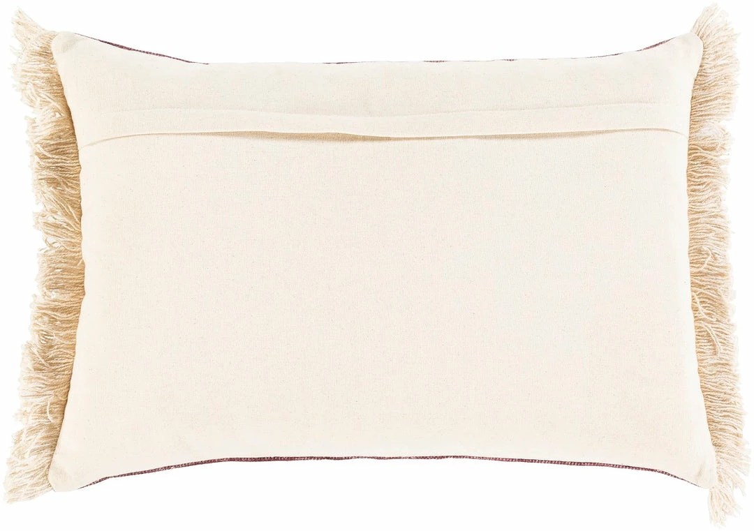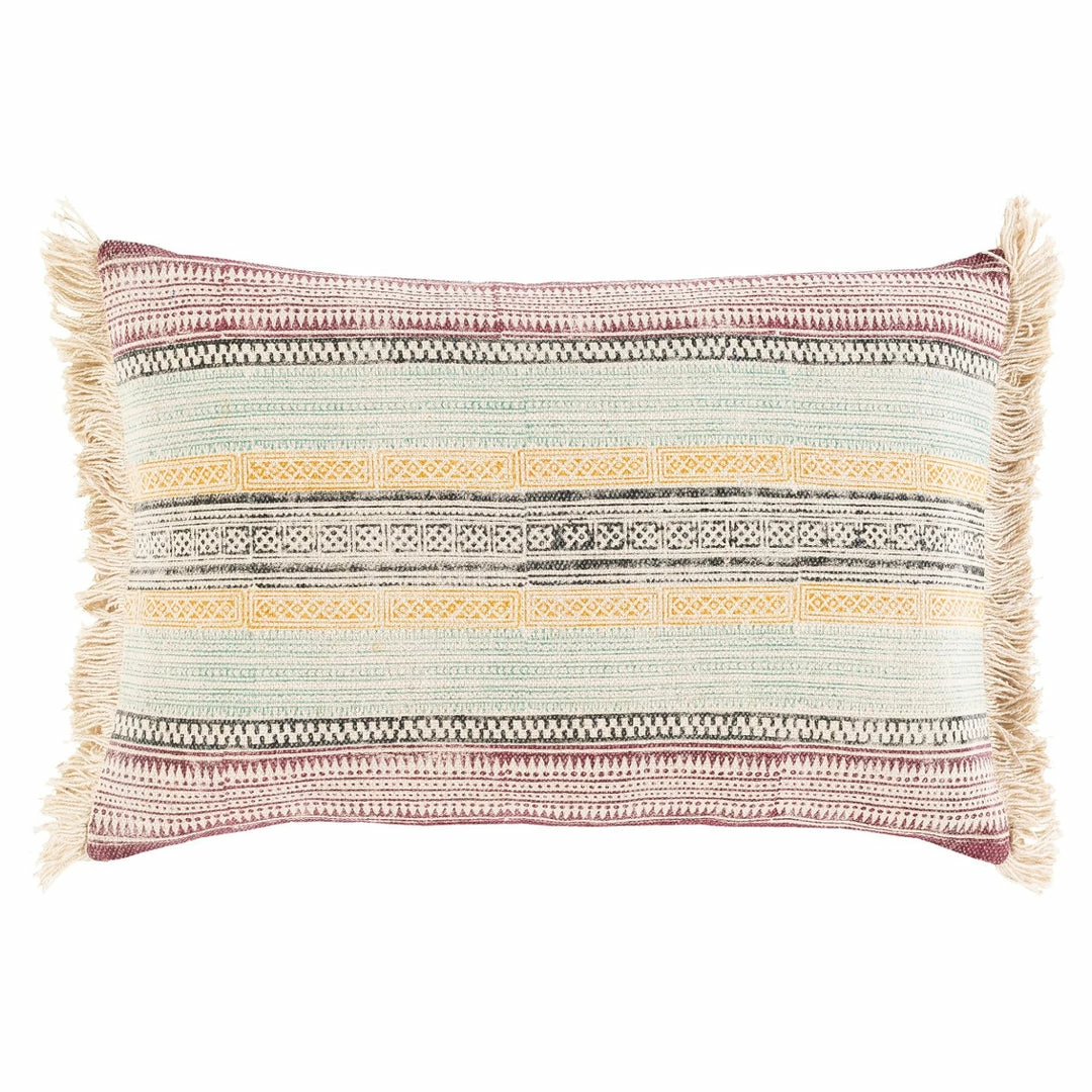Boho tribal block print folk textile lumbar accent pillow with fringe detail.Β