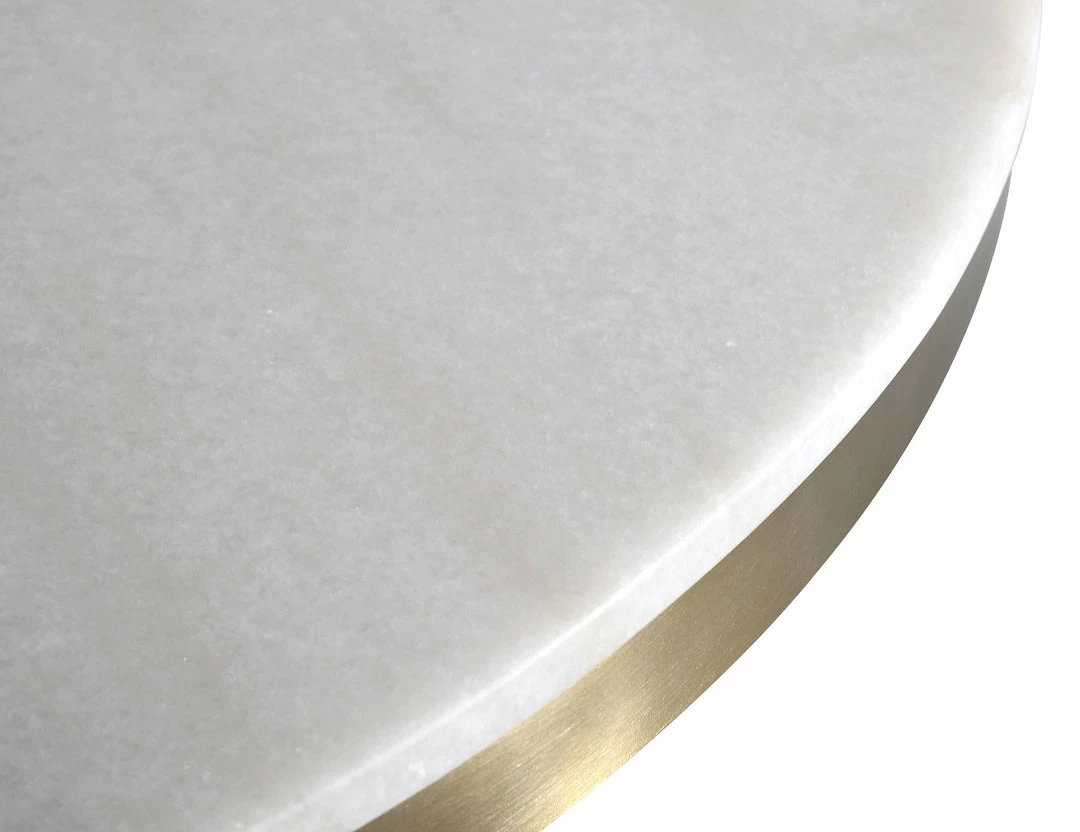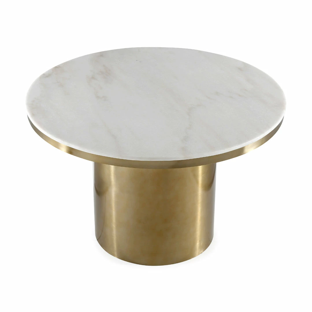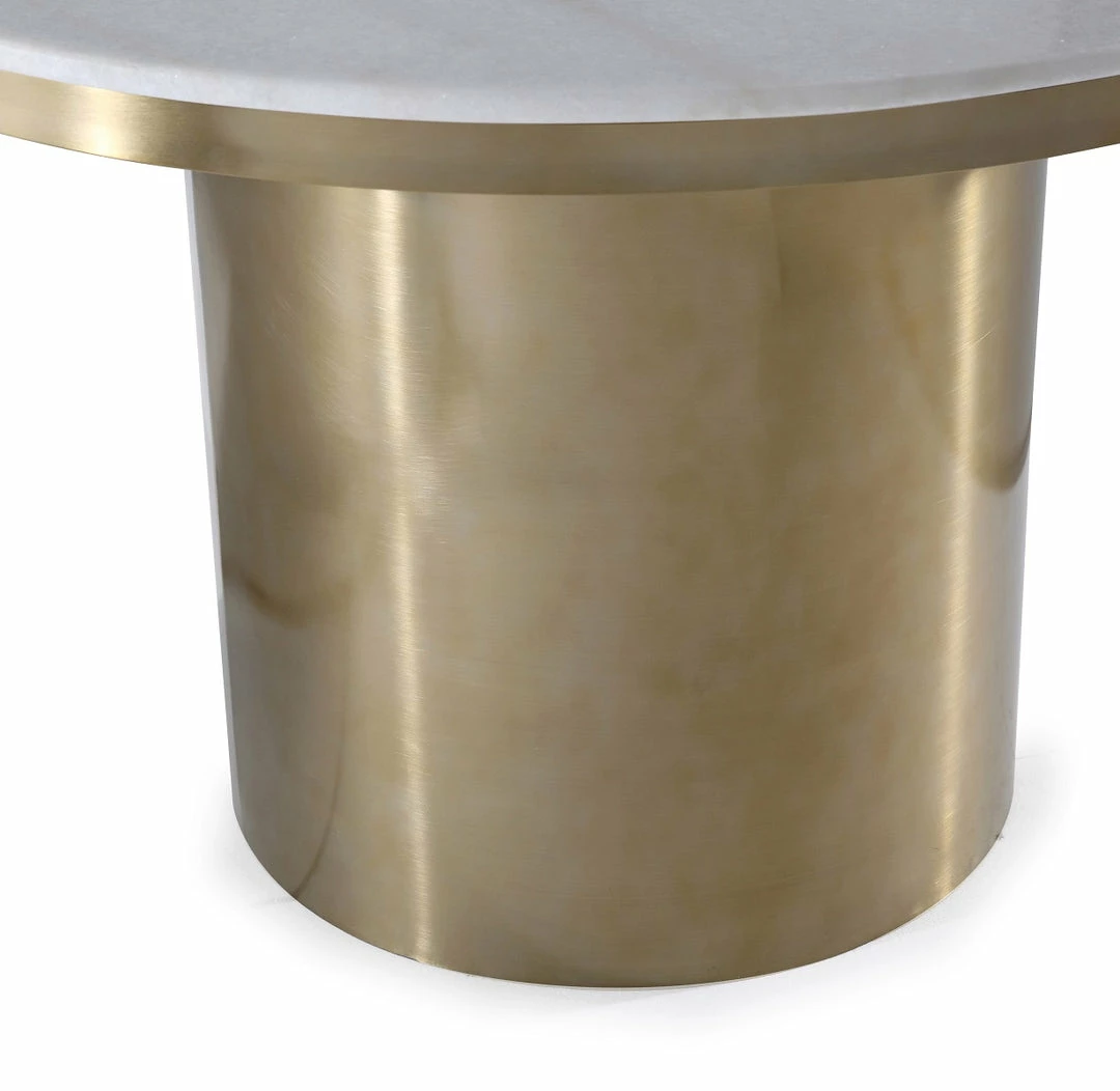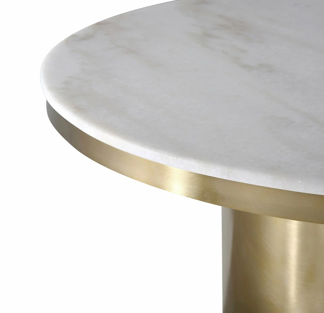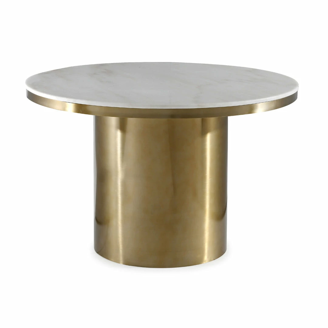 A harmonious pairing of brass and marble pleases the eye on this pedestal dining table. Its tubular base adds a modern allure as it echoes the tone of your room’s most polished pieces. This table seats four comfortably.