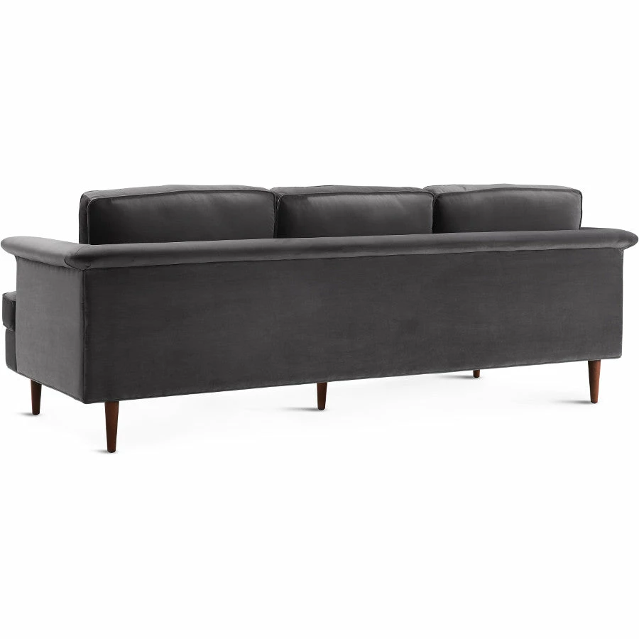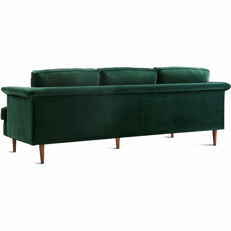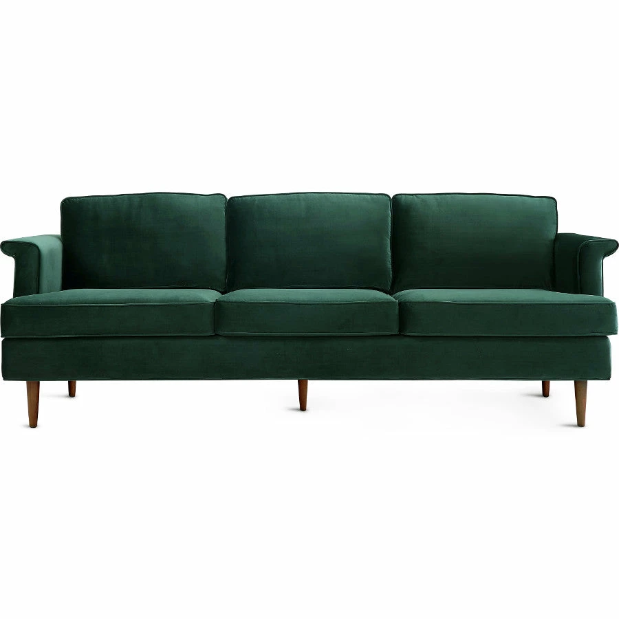 Solid and Stately, the Bowie Sofa brings tranquility in a classic mid-century design with pipe stitched cushions, and solid wood foundation for lasting comfortability. Available in a super soft 100% polyester forest green, gray, and seablue velvet.