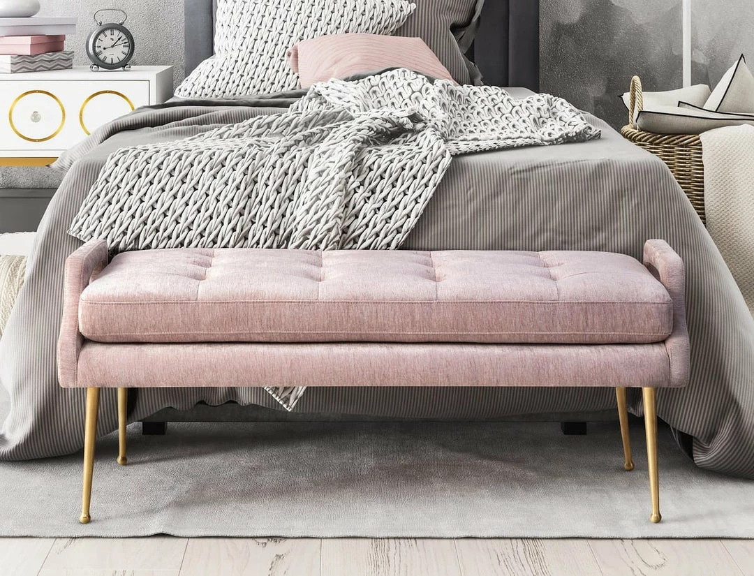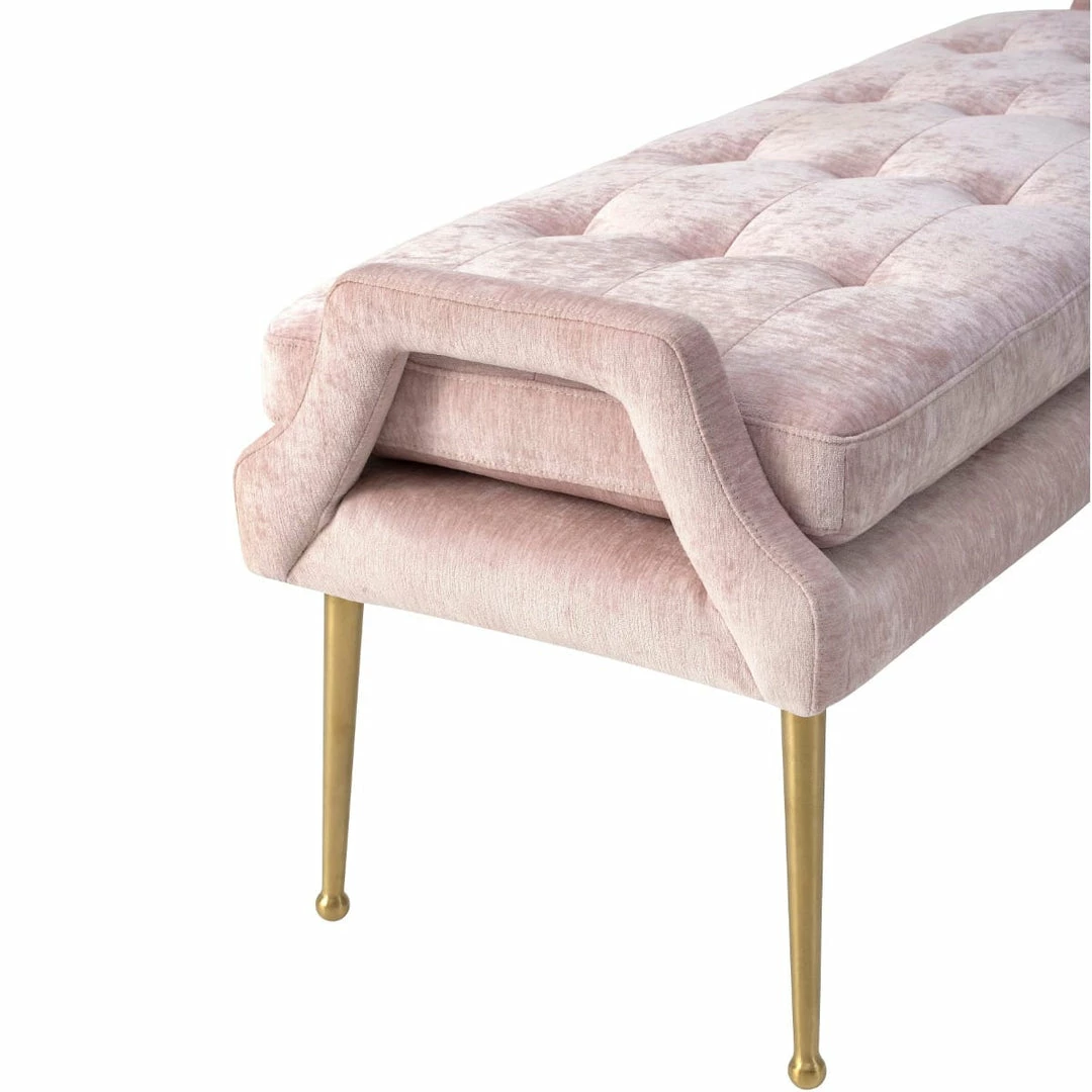 Be a trendsetter with the Deja Slub Velvet Bench. Featuring elegant gold legs and lush button tufting put this versatile bench in your entryway, living room, or bedroom. It will definitely get noticed. Available in a flirty blush and chic grey.