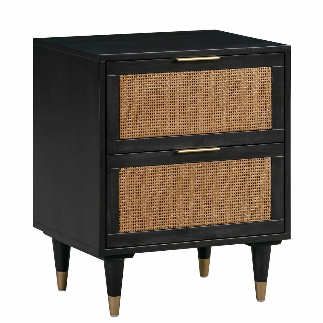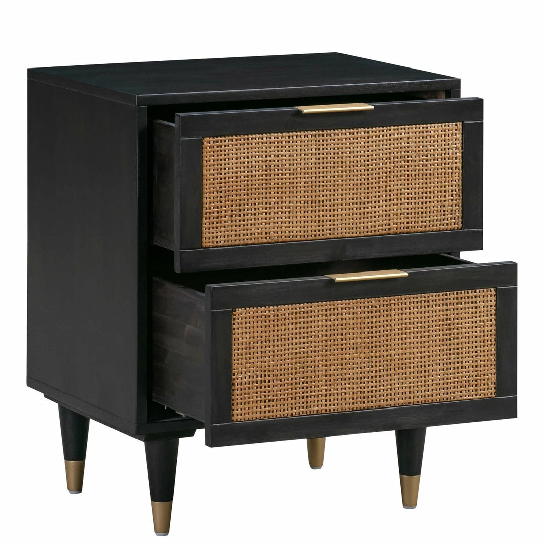 Mid century-spirited while beautifully on trend. The Coco night stands black-washed acacia wood finish frames two soft close cane paneled door fronts for a textural look with eye-catching contrast.