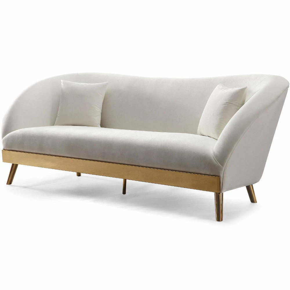 The versatile Minka sofa is upholstered in cream velvet set on a brushed gold base. For an inviting ultra chic approach place against a lively wall color.