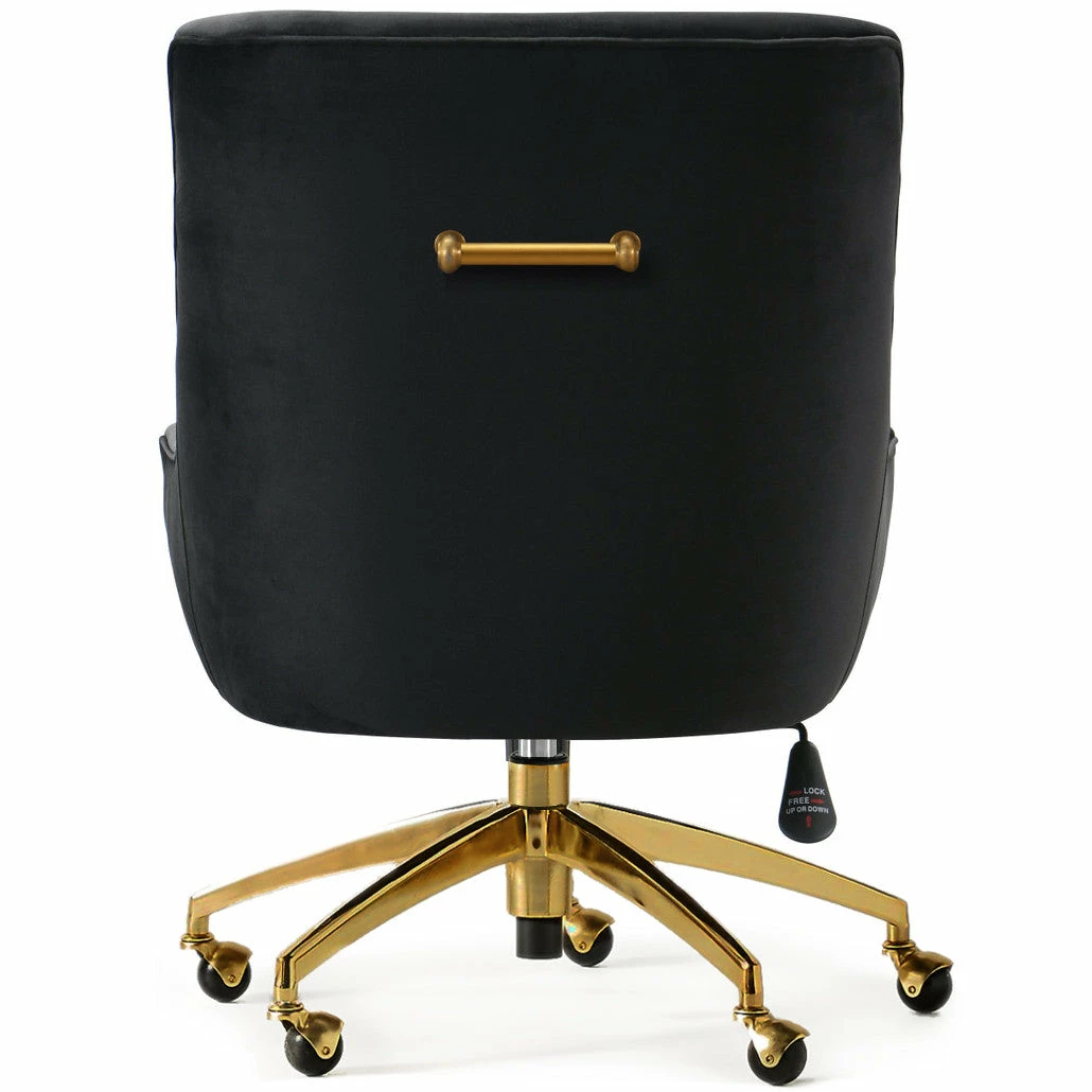 Featuring plush velvet upholstery, brass legs and a plump silhouette worth sinking into, this swoop arm design is perfect for pairing with your desk ensemble. With a 360 degree swivel and adjustable seating height, this office chair offers high style and high function for the hard working fashionista.