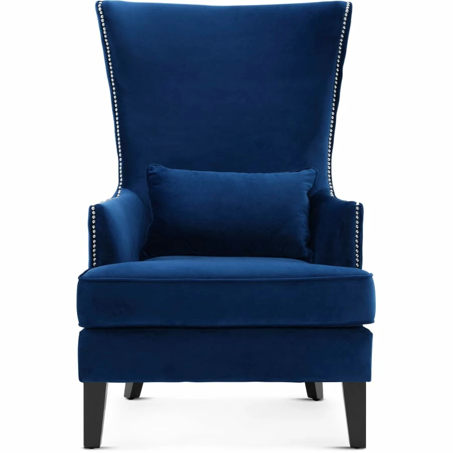 Wrap yourself in the regal Sophia winged chair. The high back, complemented by hand applied silver nail heads, convey a trim refined look. Upholstered in a deep navy blue velvet, crafted with solid kiln dried wood and dense foam support, the Sophia adds a commanding presence to any room.