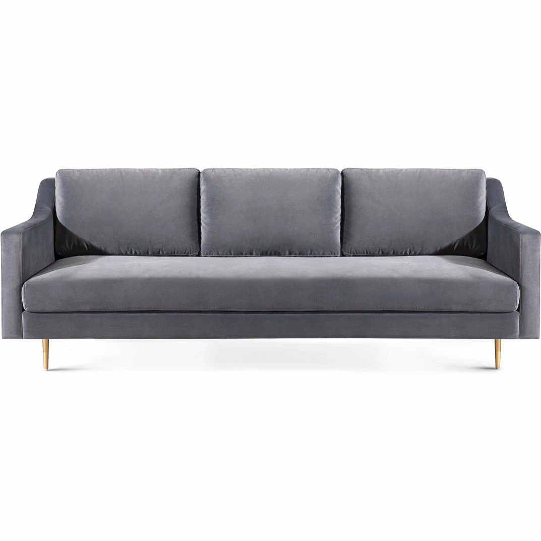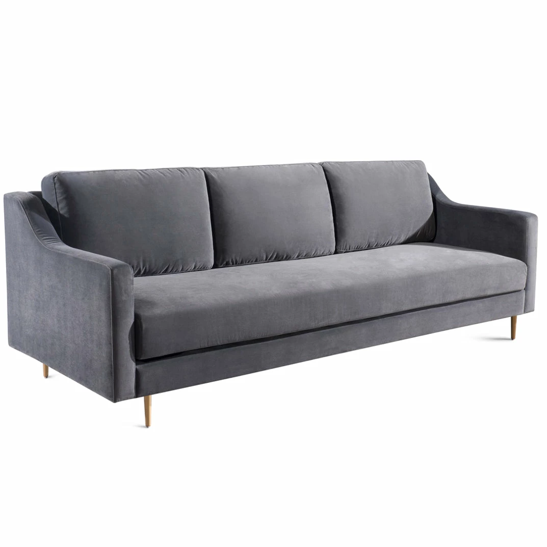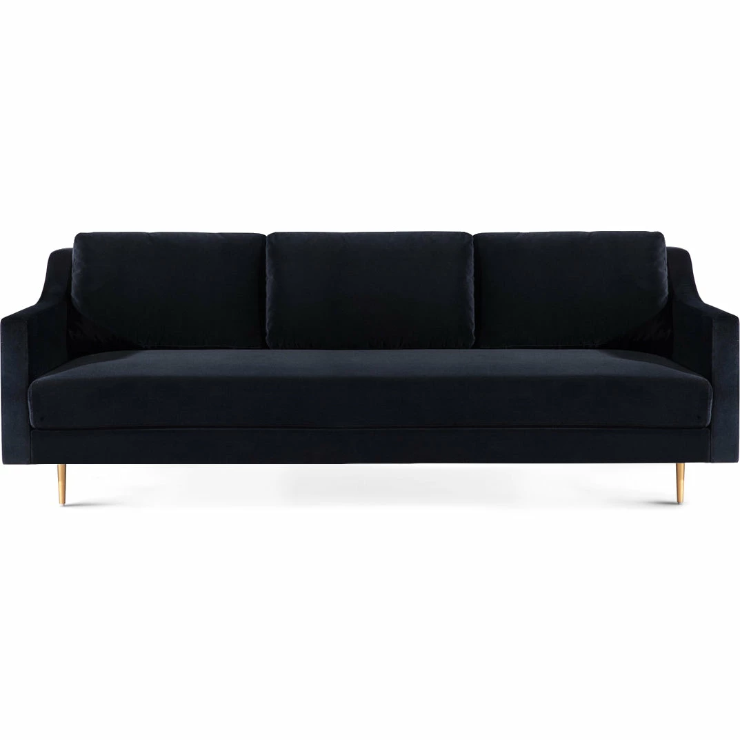 Stevie’s clean, mid-century lines soften beautifully in plush velvet while slim metal legs offer iconic style in a sophisticated brass finish. This tailored silhouette of the Stevie Sofa is gorgeous to behold, and even better to curl up in. Available in black or gray super soft polyester velvet.