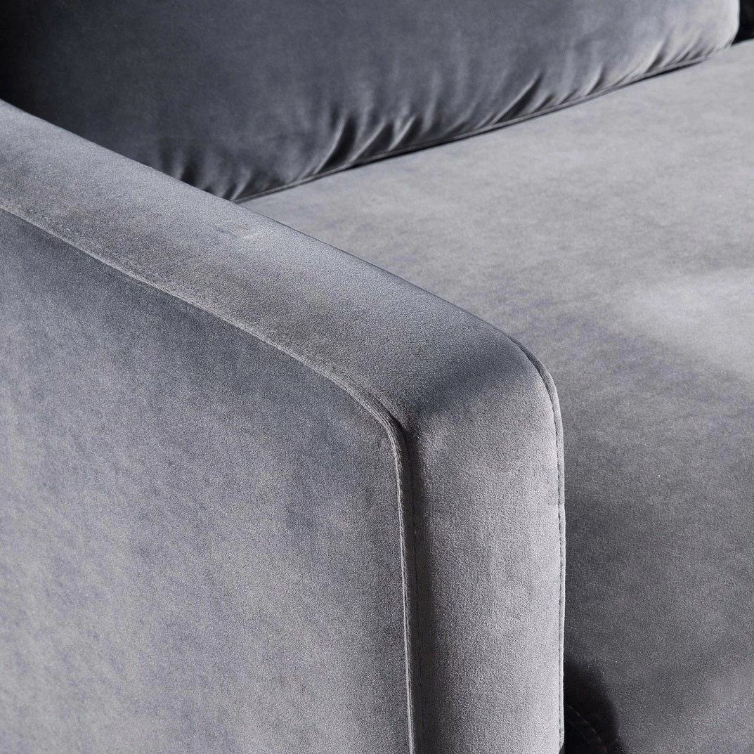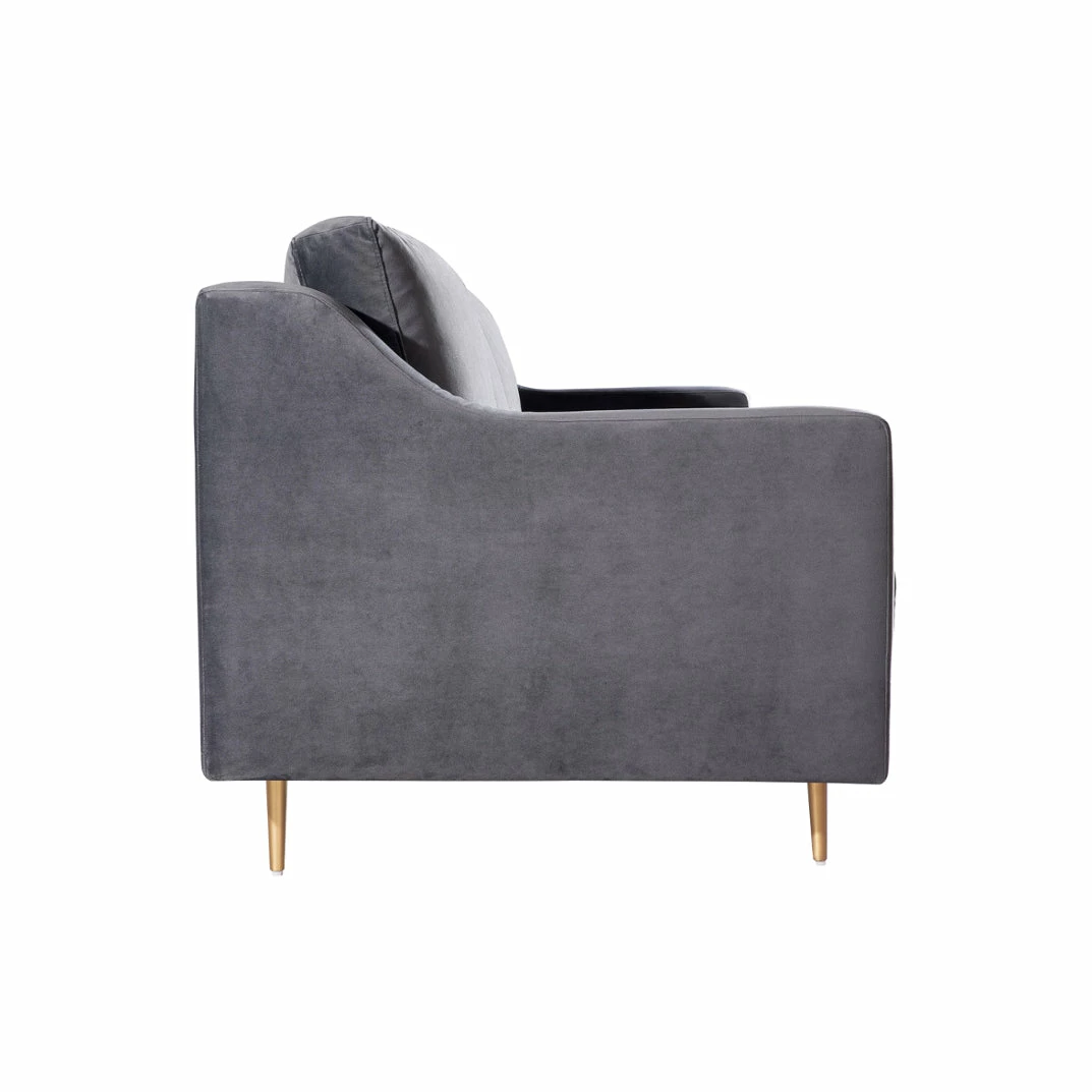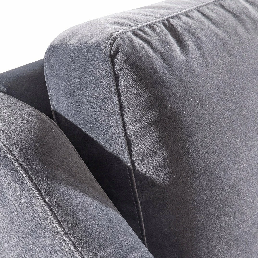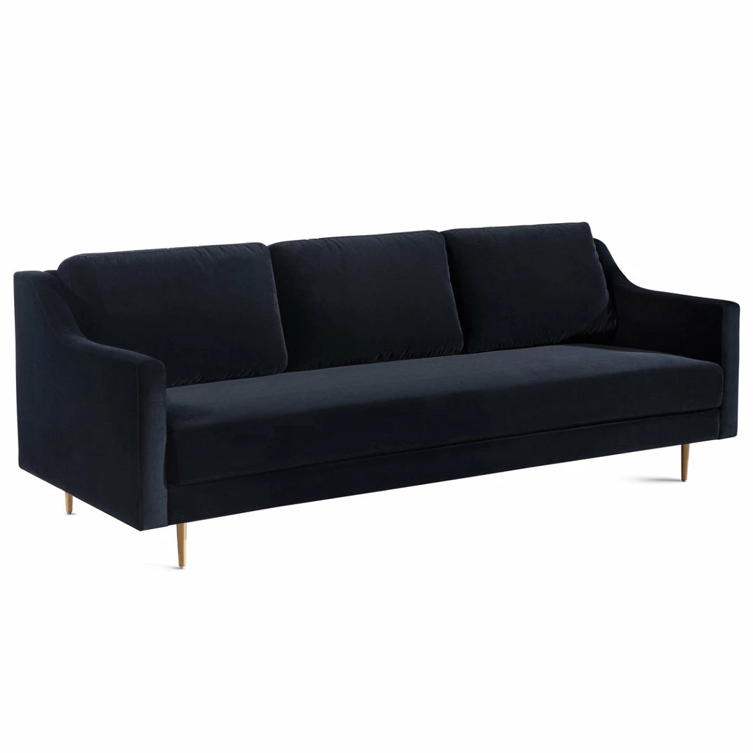 Stevie’s clean, mid-century lines soften beautifully in plush velvet while slim metal legs offer iconic style in a sophisticated brass finish. This tailored silhouette of the Stevie Sofa is gorgeous to behold, and even better to curl up in. Available in black or gray super soft polyester velvet.