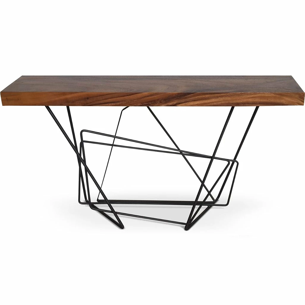 The Forge console table solid 100% chamcha wood plays beautifully with an abstract iron base for an organic modern look.ย Perch under an entry way mirror or along hallways displayingย floral arrangements, personal photos; where ever placed this console table’s striking presence is sure to command attention.ย