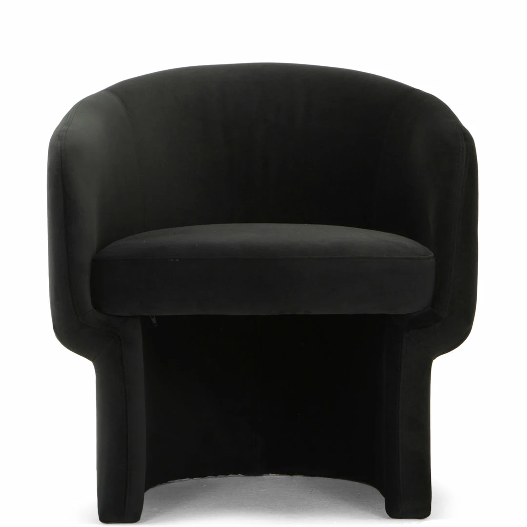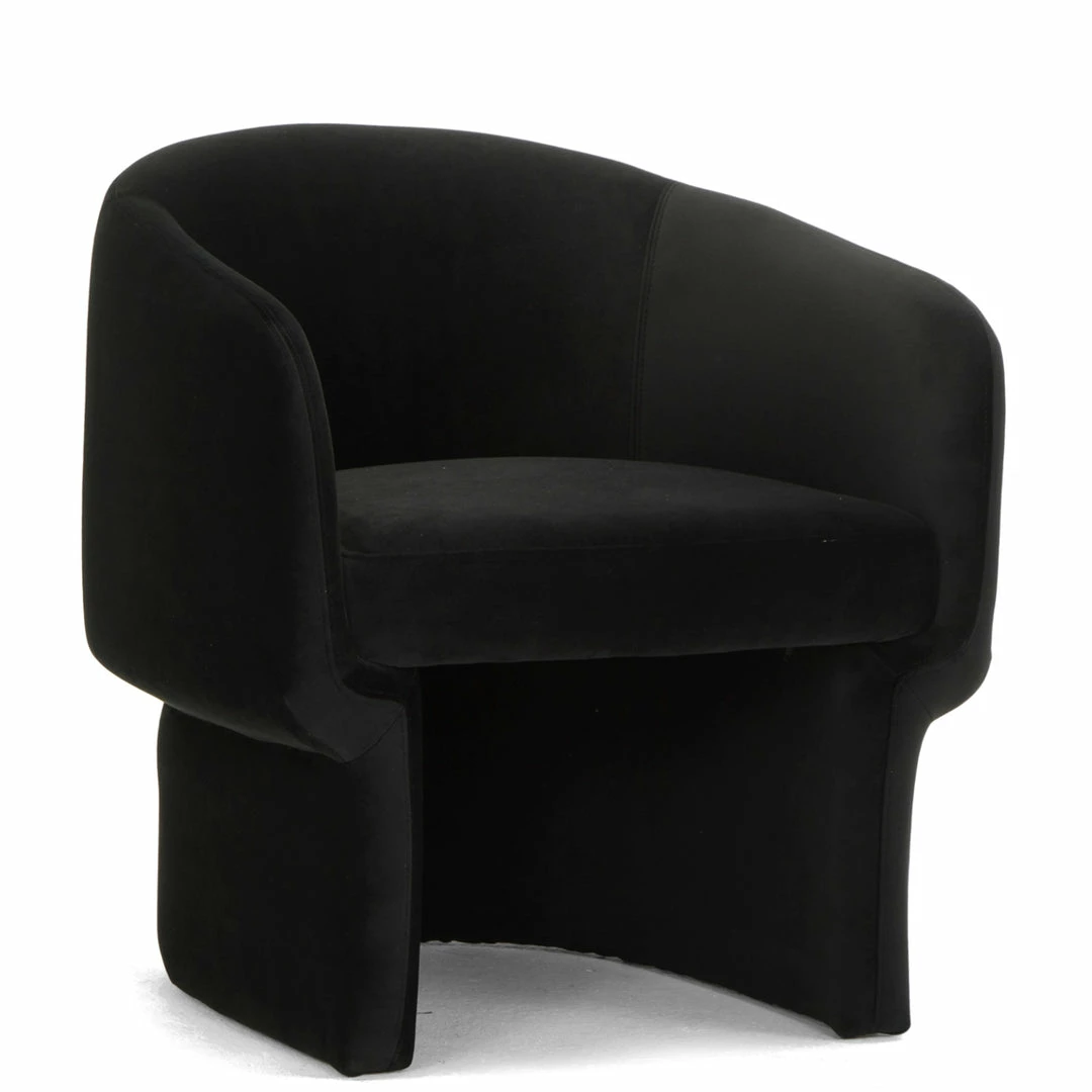 Inspired by innovative avant-garde architecture, the curved form of the Dita Chair creates a unique approach to seating. Fully covered in plush velvet upholstery, this petite chair is perfect for those wanting to add pop of graphic black to any space.