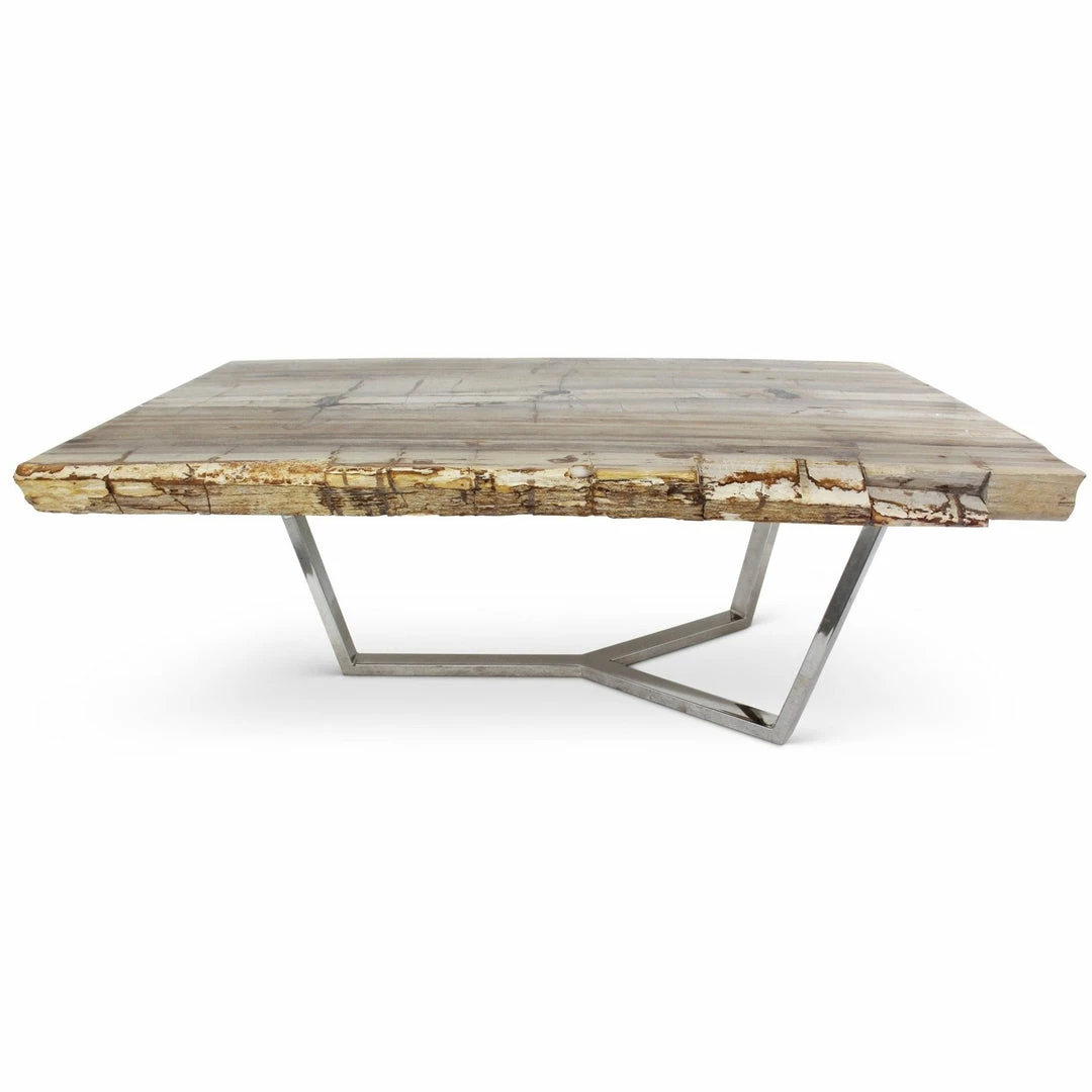 Materials: TOP- solid natural edge Petrified Wood Slabย | BASE- Polished Stainless Steel