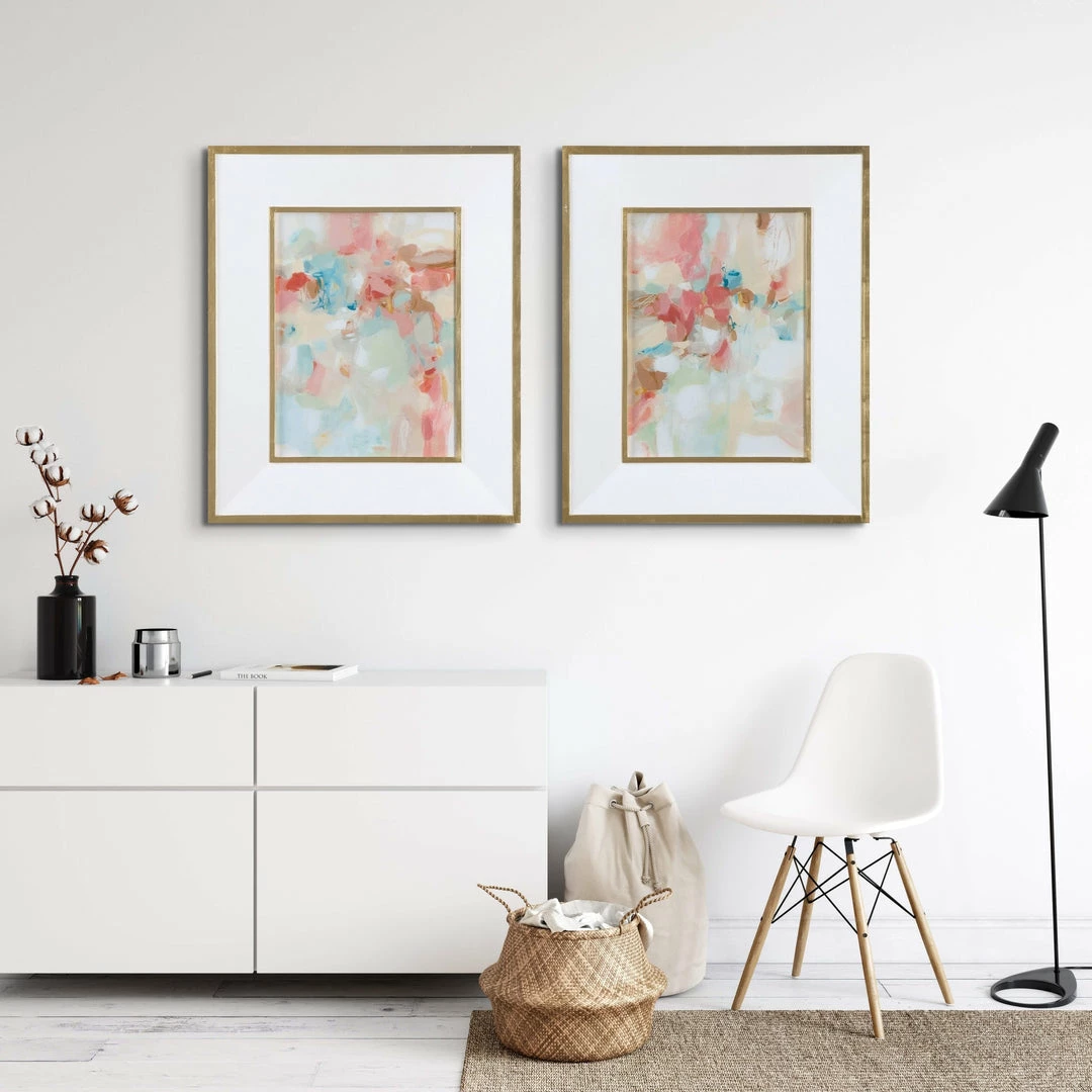 Bursting with pastel colors, these abstract prints bring an timeless elegance to a space. Light blue, blush, cream, and sea foam green hues pop against the glossy, white frame surrounding each print. For a touch of glamour, a gold leaf outer frame and matching fillet are added. Each print is placed under protective glass.