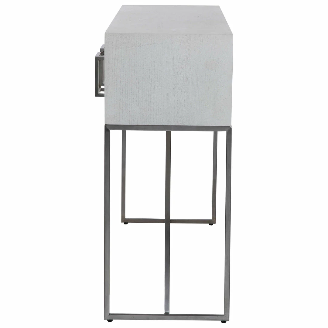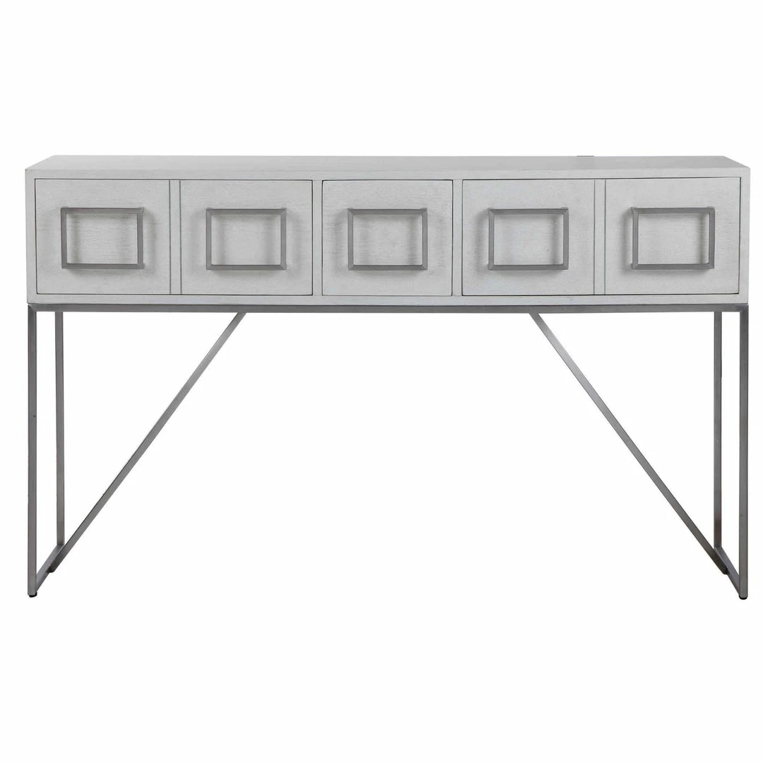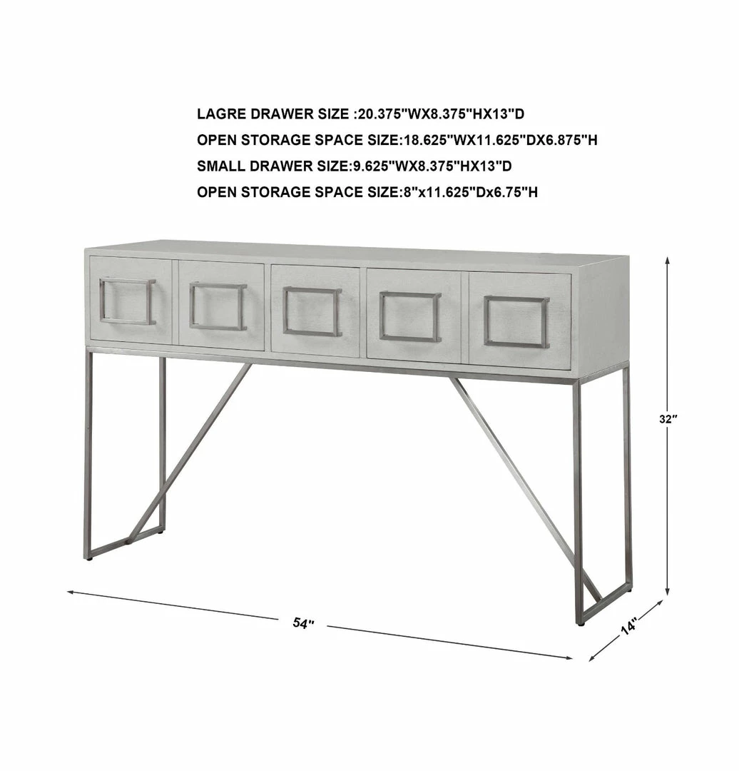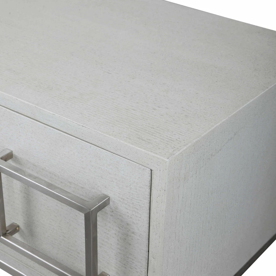 Clean contemporary styling, featuring oak veneer finished in a soft white with light gray distressing. Accented with statement hardware in brushed nickel stainless steel with a coordinating base. Has two double drawers and one single drawer in the center.