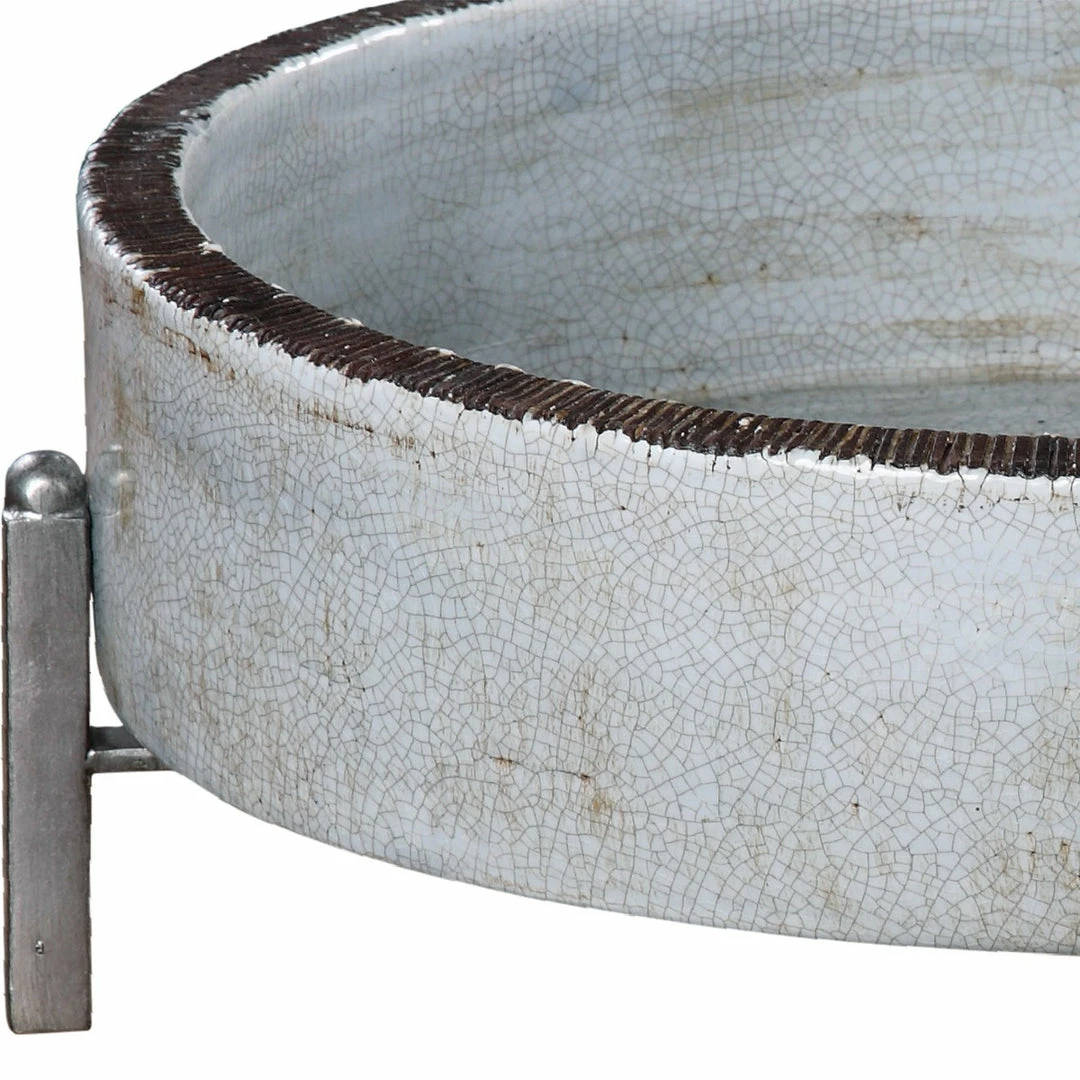 Distressed, crackled pale gray ceramic bowls with rust undertones and lightly antiqued silver metal stands. Due to the nature of fired glazes on ceramic, finishes will vary slightly.ย