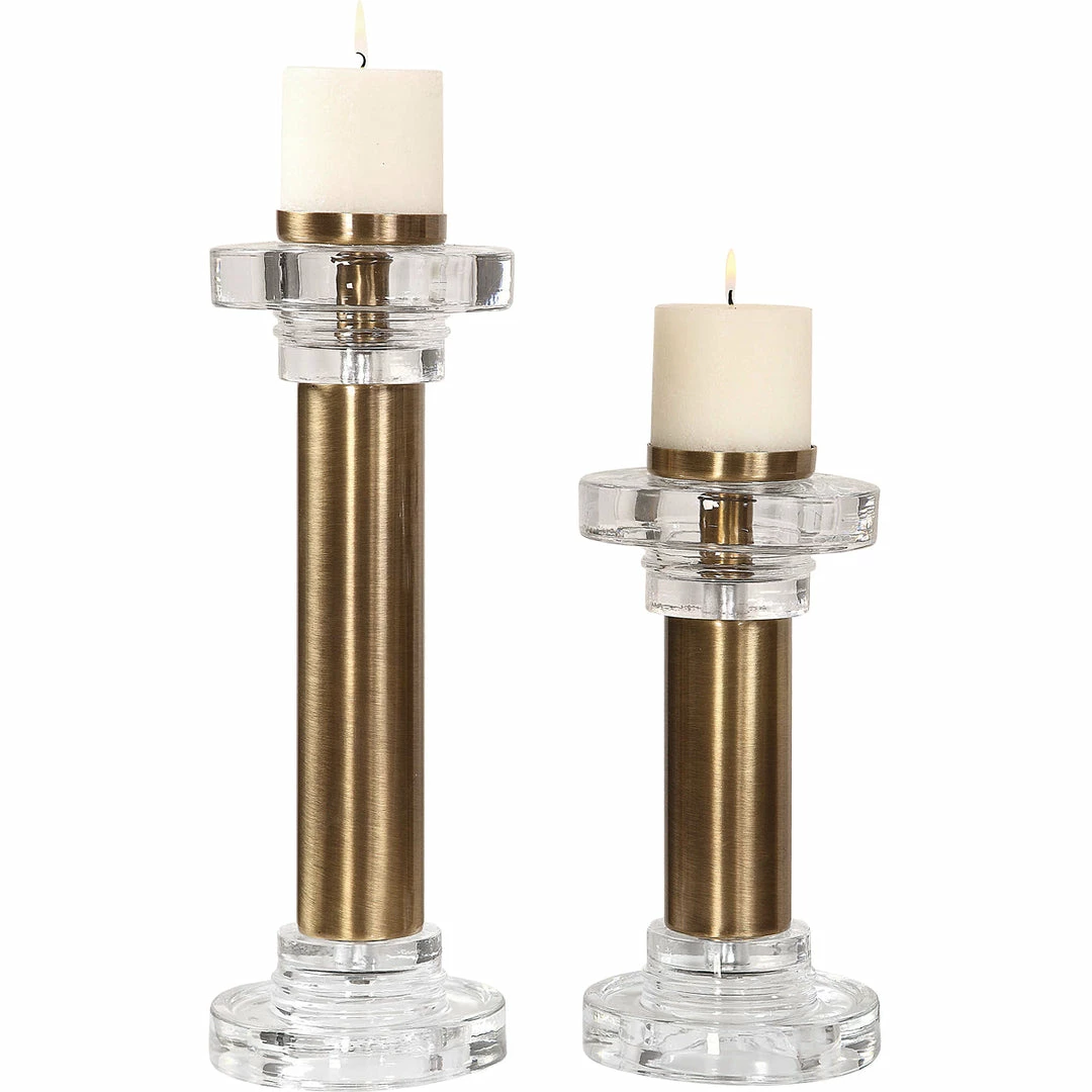 The Gunner Pillar Candle Holders have plated, brushed brass cylinders with chunky clear glass accents.