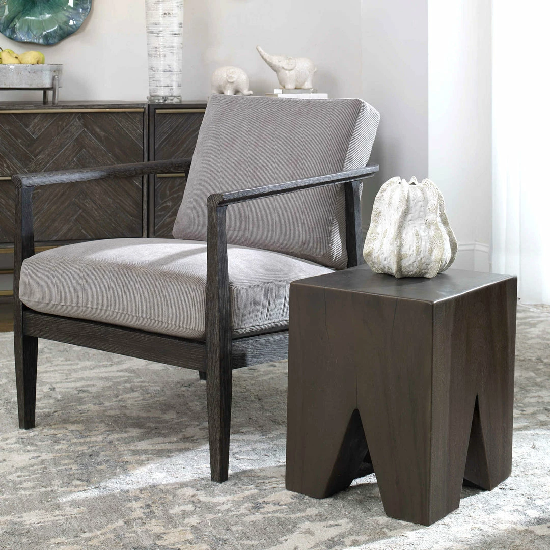 Constructed from solid suar wood, this accent stool is finished in satin gray with natural texture and grain that makes each piece unique. Can act as a stool or pull-up table.