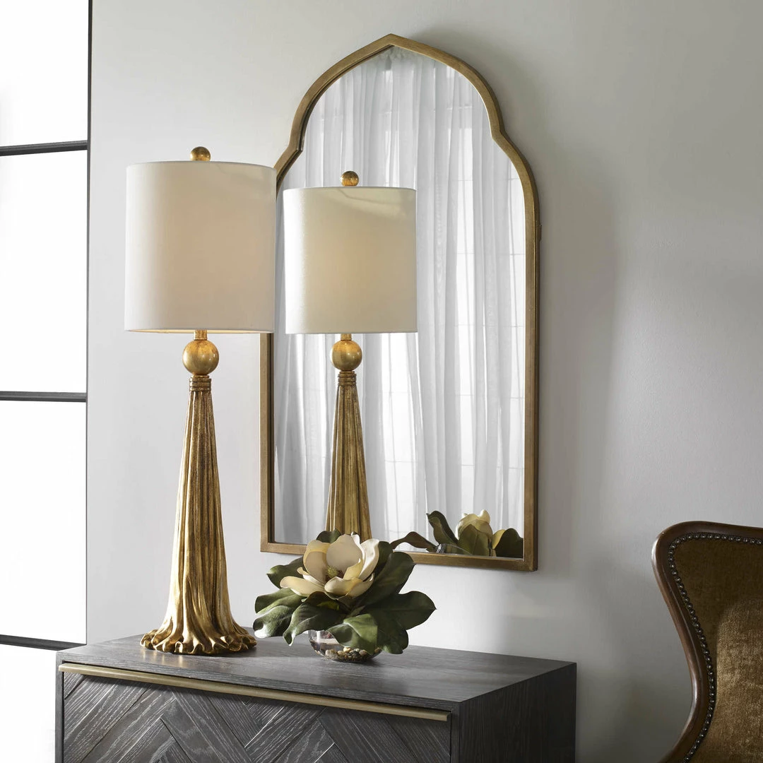 Hand forged metal frame finished in plated, antiqued gold.