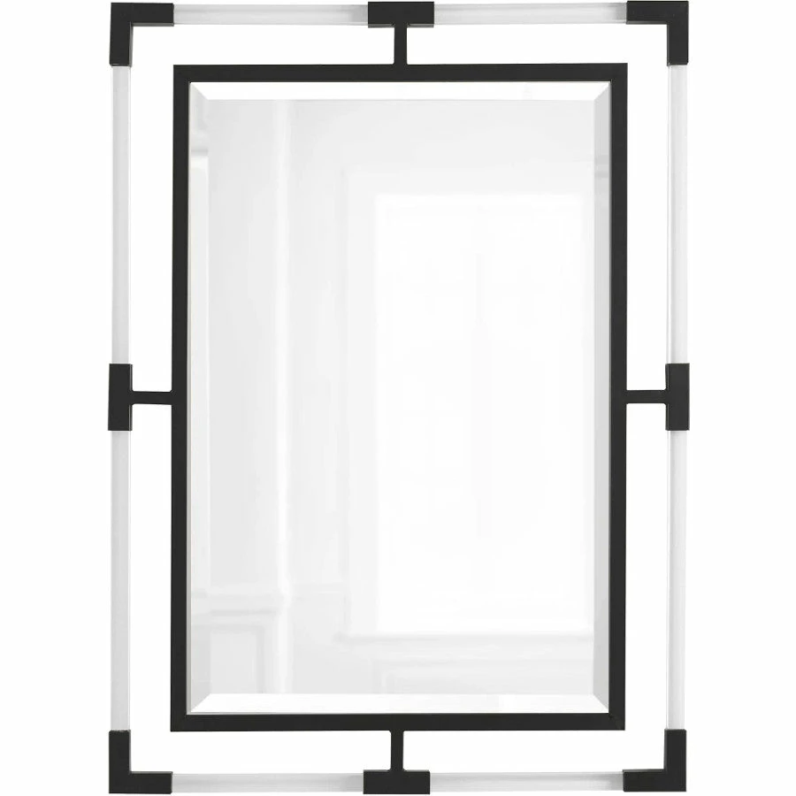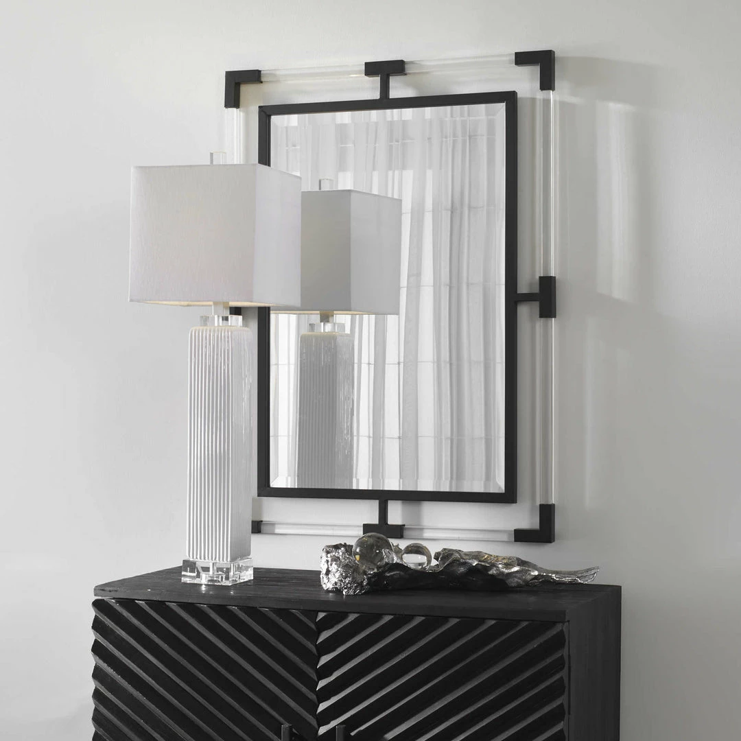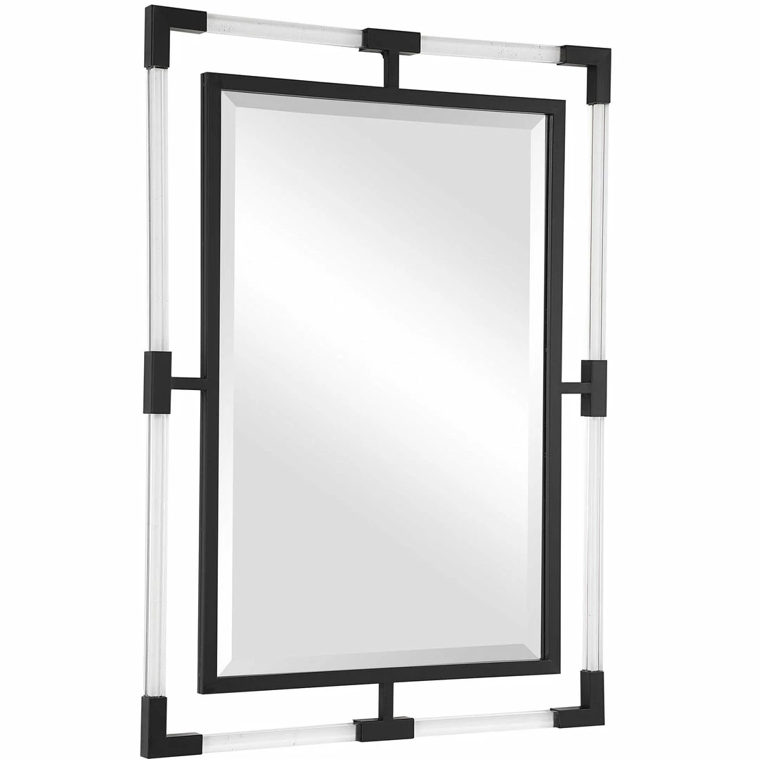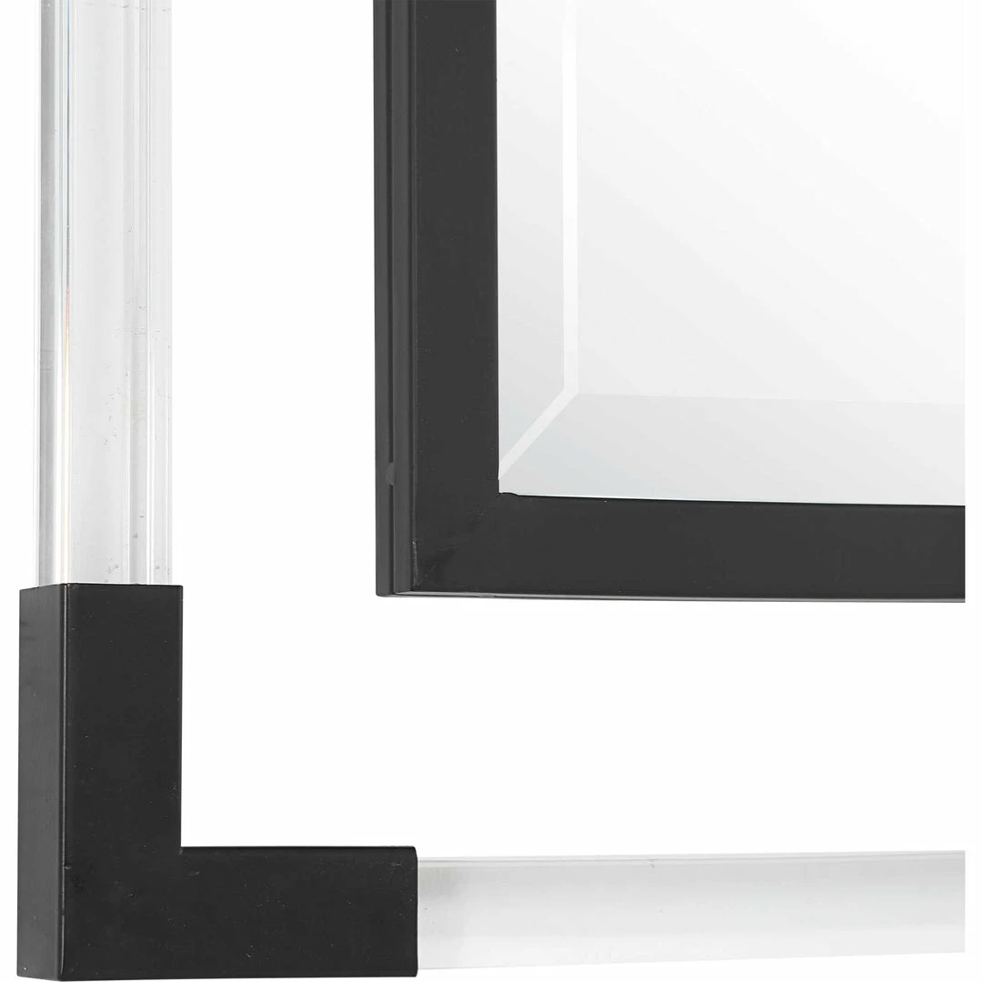 This mirror can certainly serve as a focal point for any room. Combining forged iron finished in matte black, with suspended, clear acrylic, solid bars creating a modern feel. Mirror has a generous 1 1/4″ bevel.